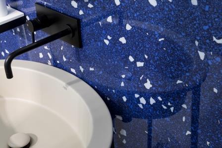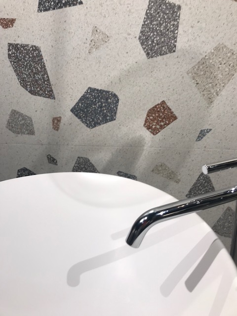 The use of neutrals and pastel colours remains strong but this year we saw them combined with much stronger colours, particularly blues, greens and pinks. Bold, vibrant colours were used both on their own as well as to bring a new perspective to other effects such as concrete or terrazzo. Terrazzo was also given a new look with tiles where the effect had been magnified.