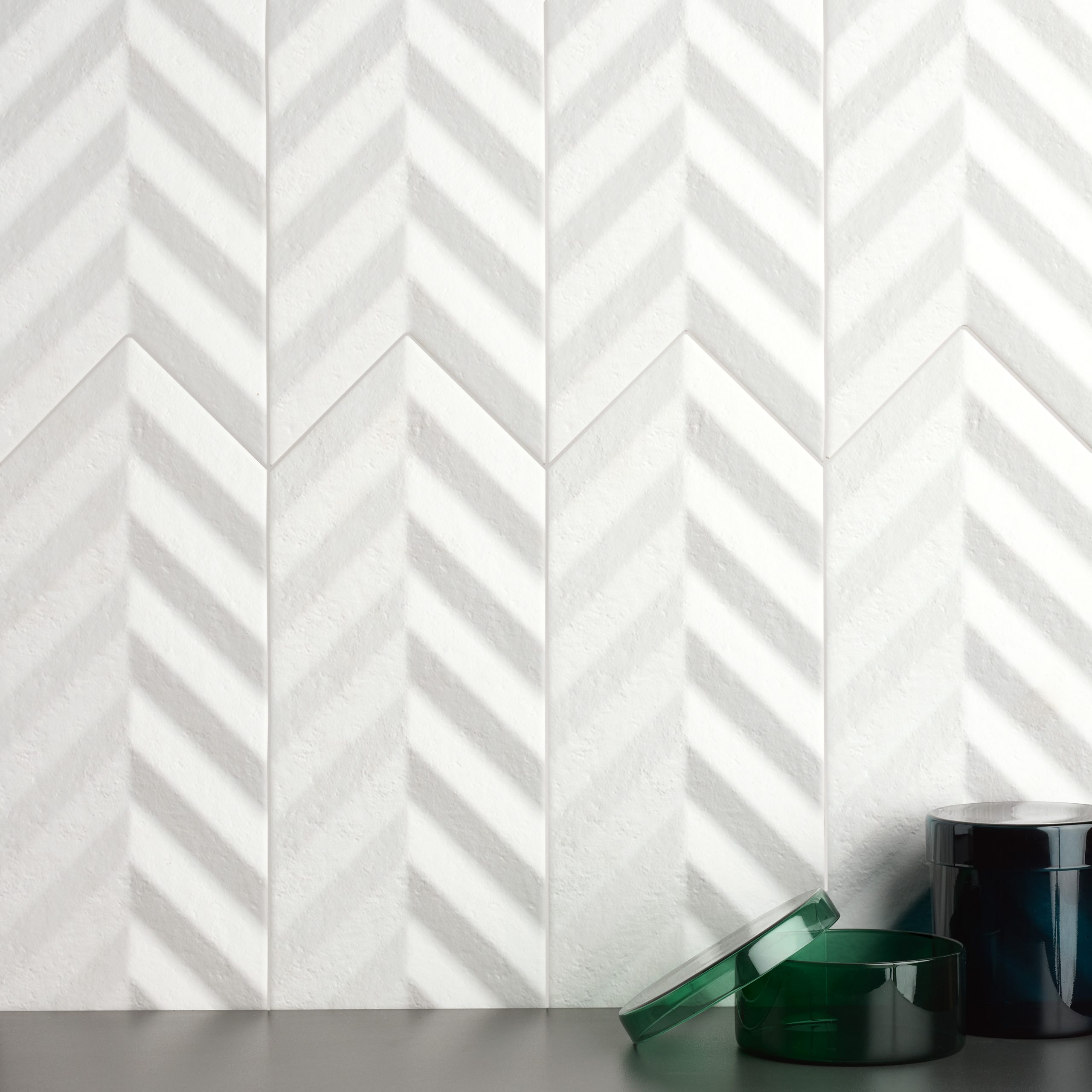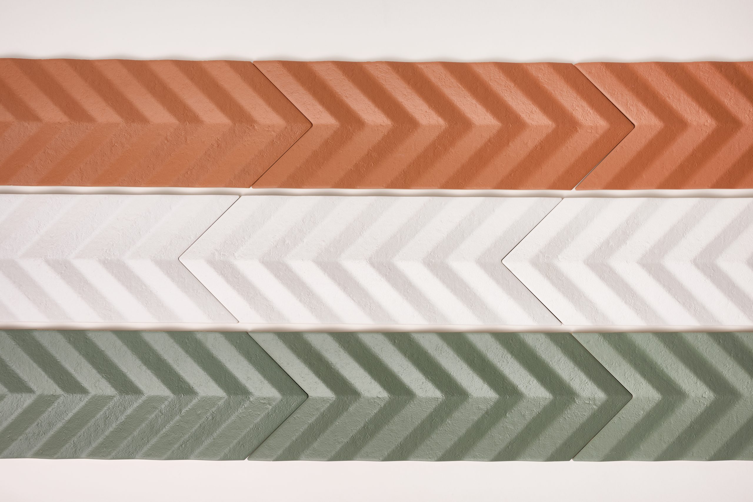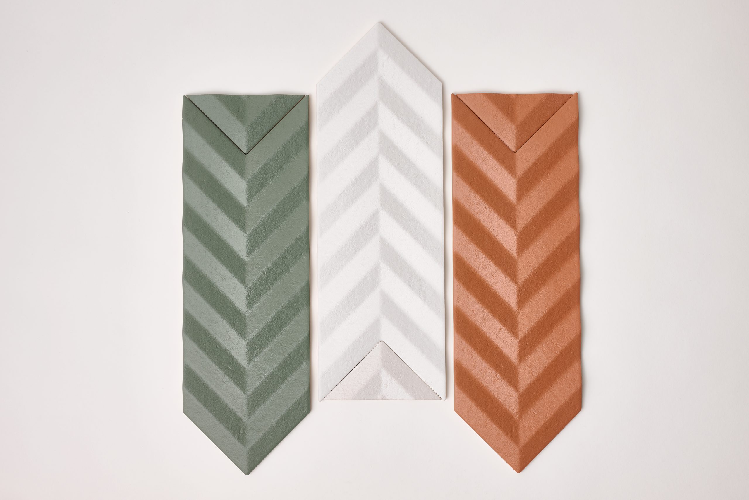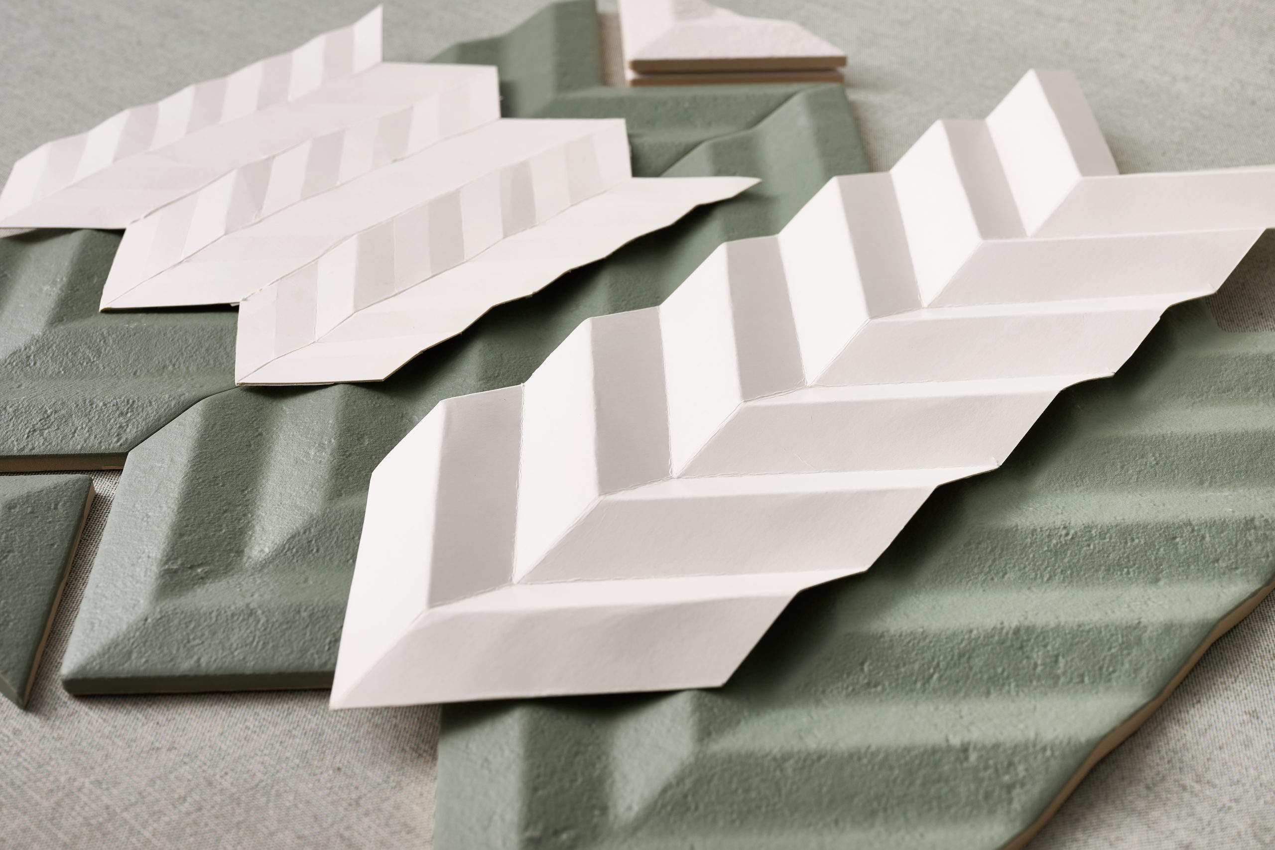 This collection is inspired by pleats and the accordion-like movement of pleated fabric. This 150x380mm collection, in a choice of three colours (white, clay and green) features a stone-like texture on its surface.