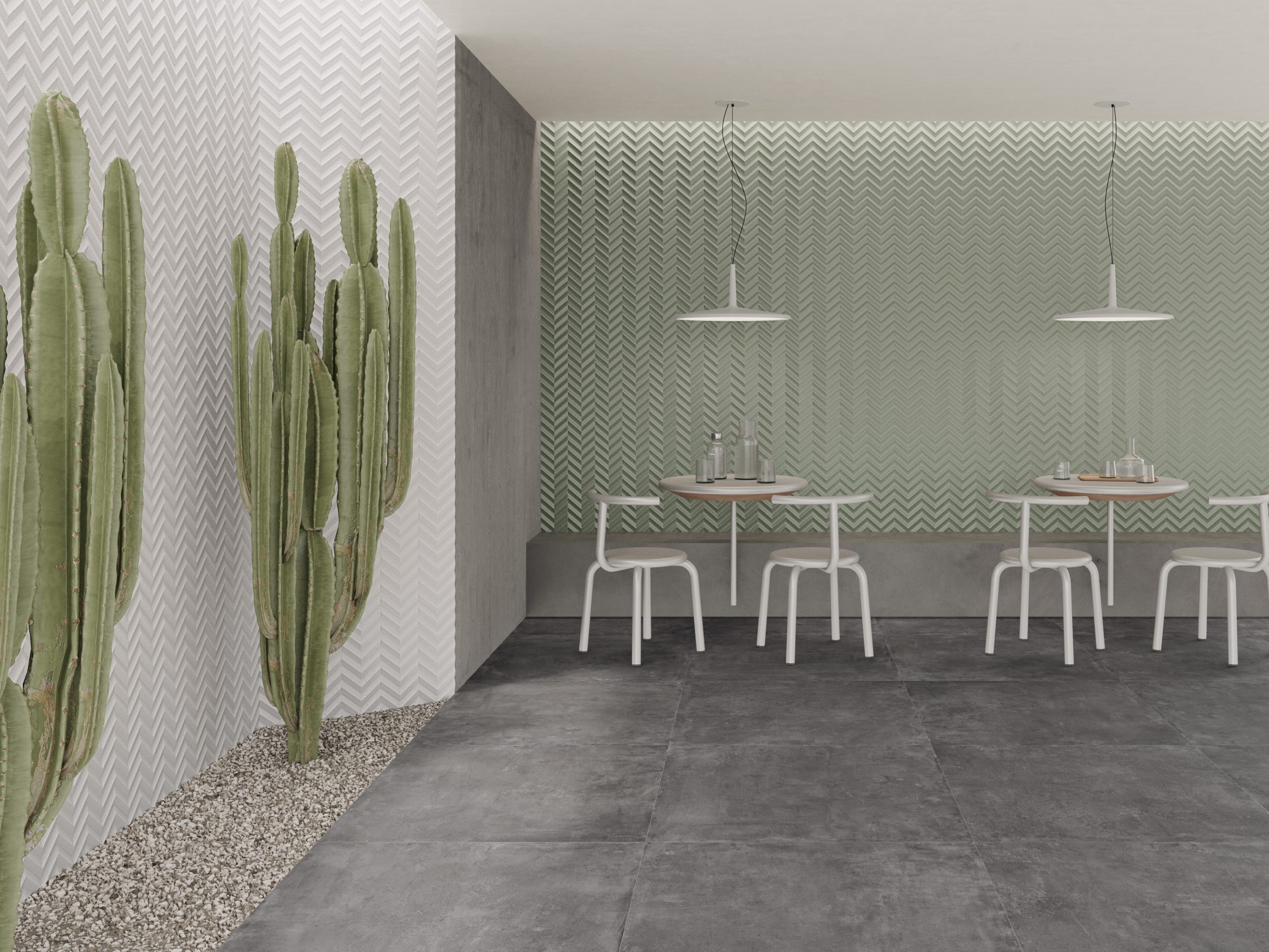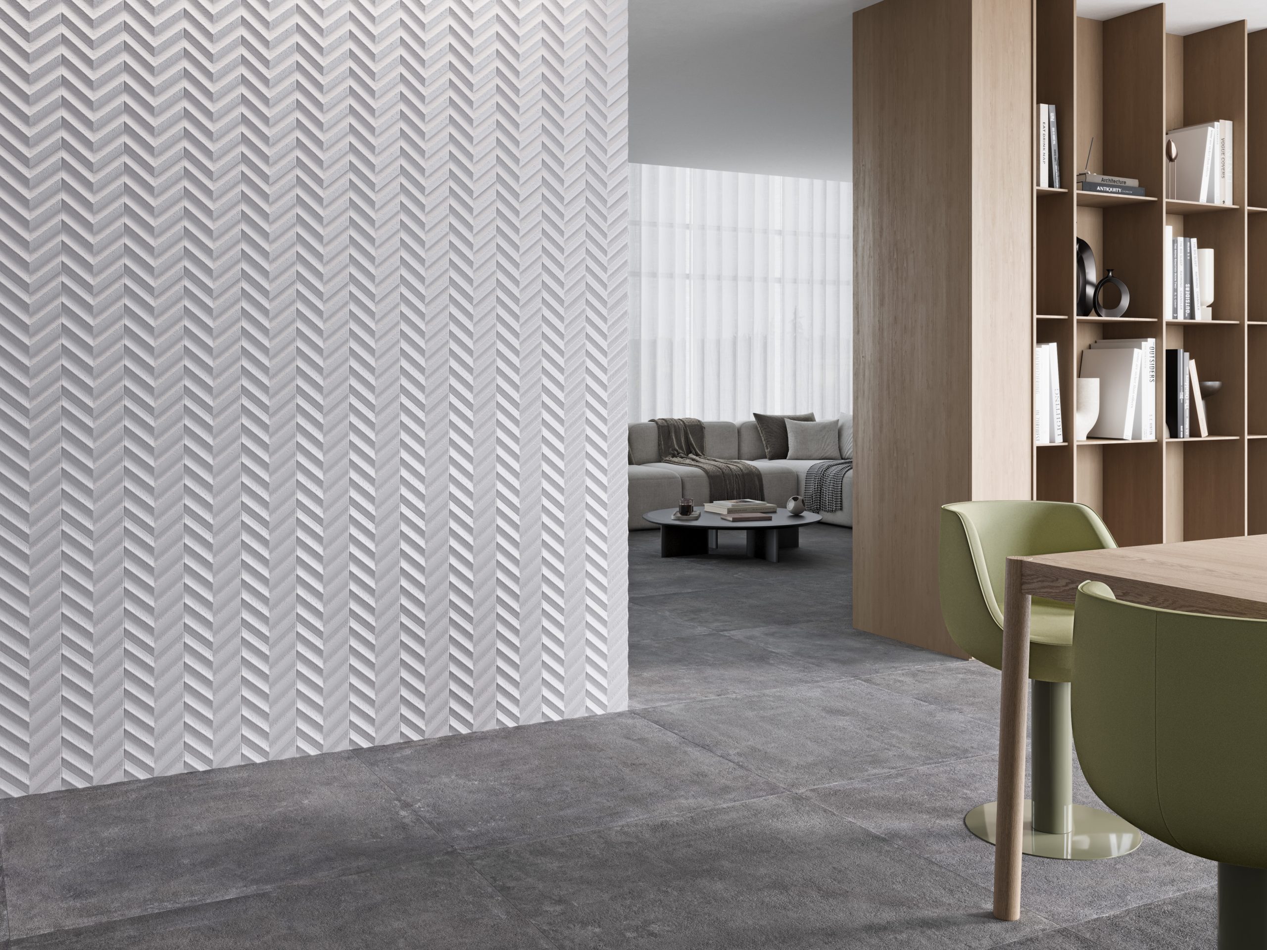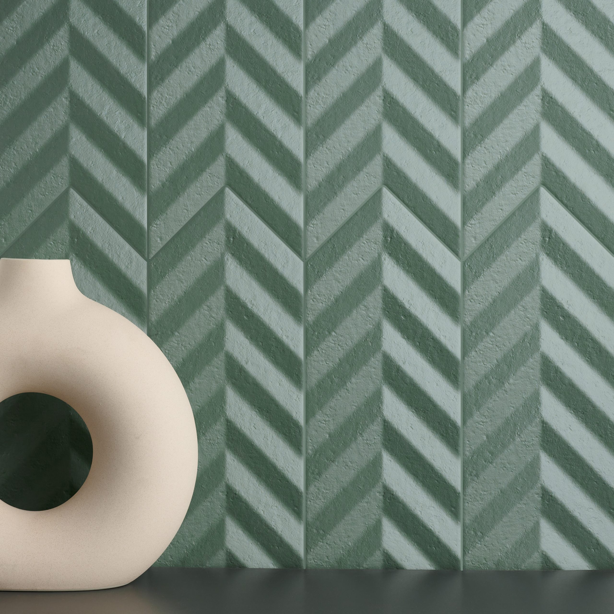 This collection is inspired by pleats and the accordion-like movement of pleated fabric. This 150x380mm collection, in a choice of three colours (white, clay and green) features a stone-like texture on its surface.