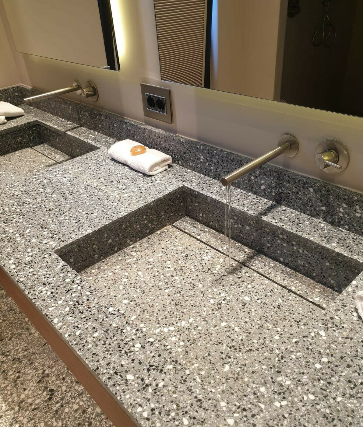 Duracem is a cementitious terrazzo comprising of hard granite and marble minerals suspended in a cement-based binder.