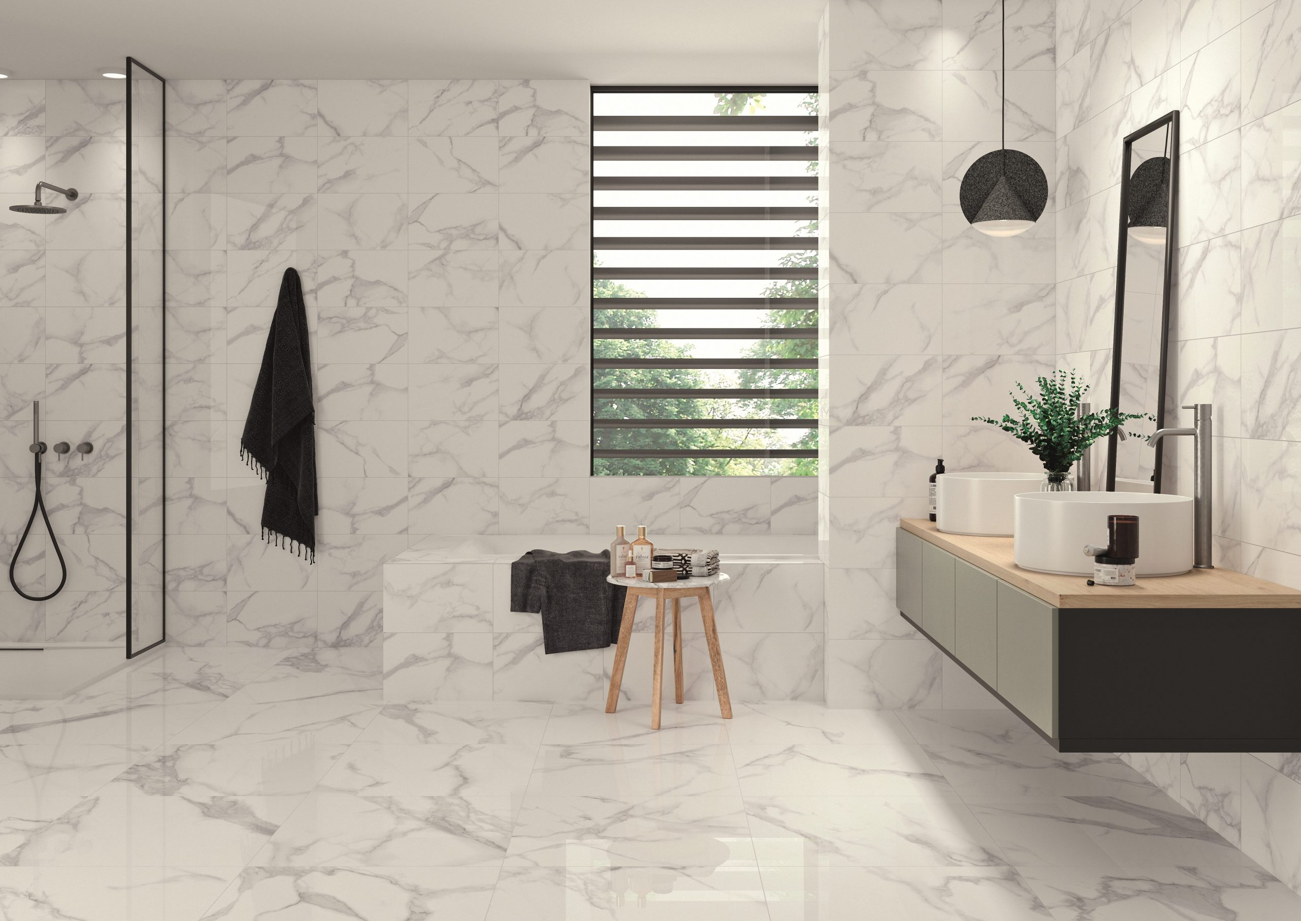 Gallery is a gloss marble effect ceramic tile with wispy grey veining in a 250x400mm format.