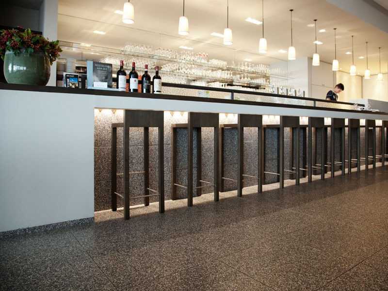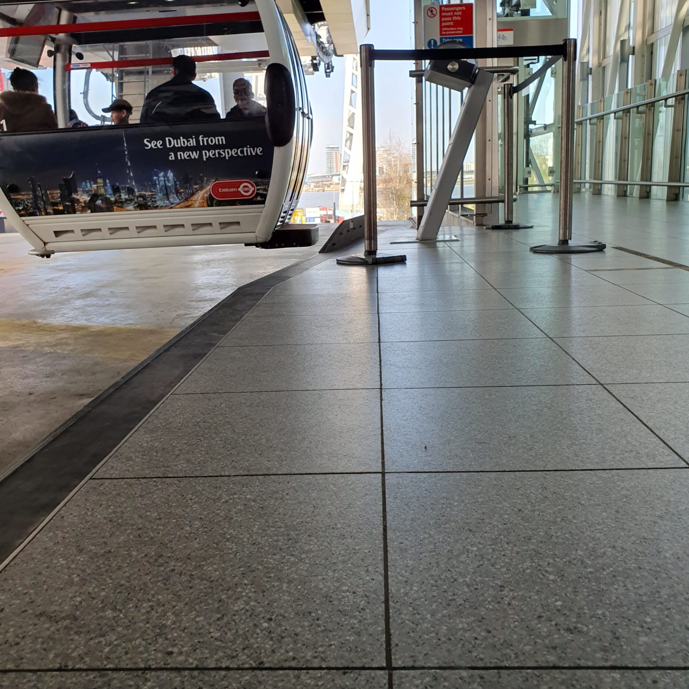 Granitocem, a popular choice for both transport and retail sectors, comprises entirely of hard granite and quartz minerals suspended in a vacuum-formed cement-based matrix. Cementitious terrazzo demonstrates an extremely high resistance to wear and is Class 0 fire resistant. It is produced by vibro-compressing and vacuum compacting granite, Portland cement and water, each tile is made up of 75% natural stone.