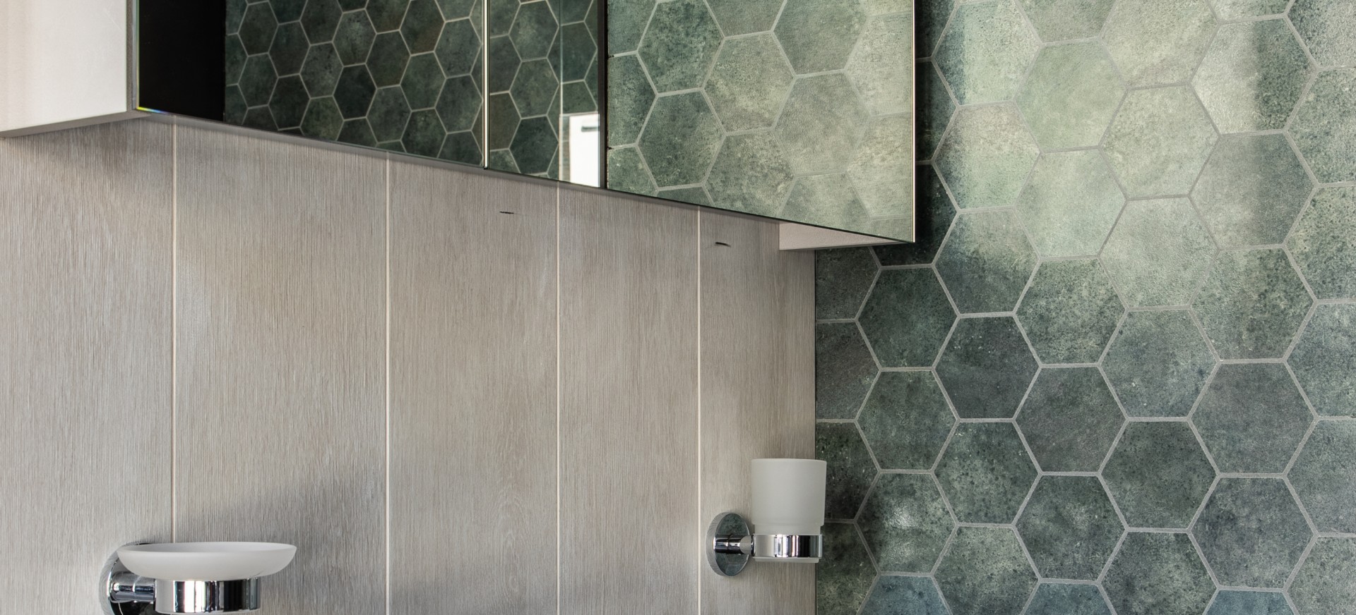 Standard sizes available are 600x600mm, 600x300mm, 600x100mm and 75x300mm. There’s also a three-dimensional décor called Kaptur available in 600x300mm and Link, a hexagonal pattern available in 196x342mm.
