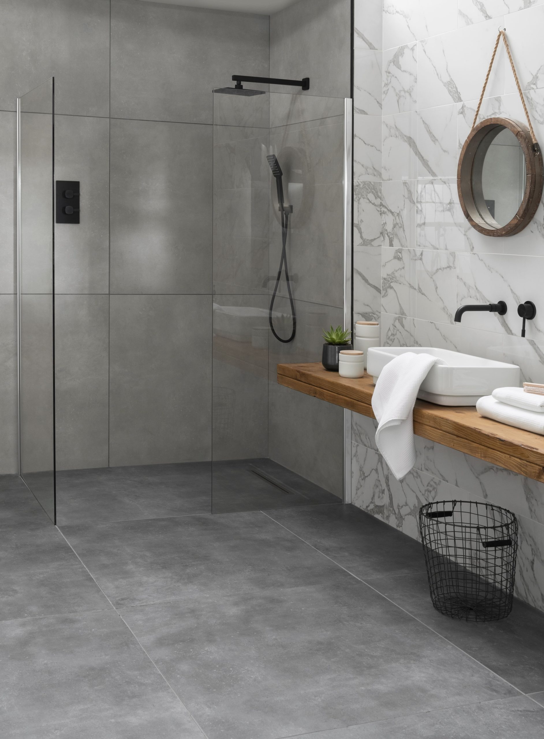 Kaste01 is a porcelain tile collection featuring a new innovation in shower trays and available in three contemporary grey toned colours: basalt, grit and cement.