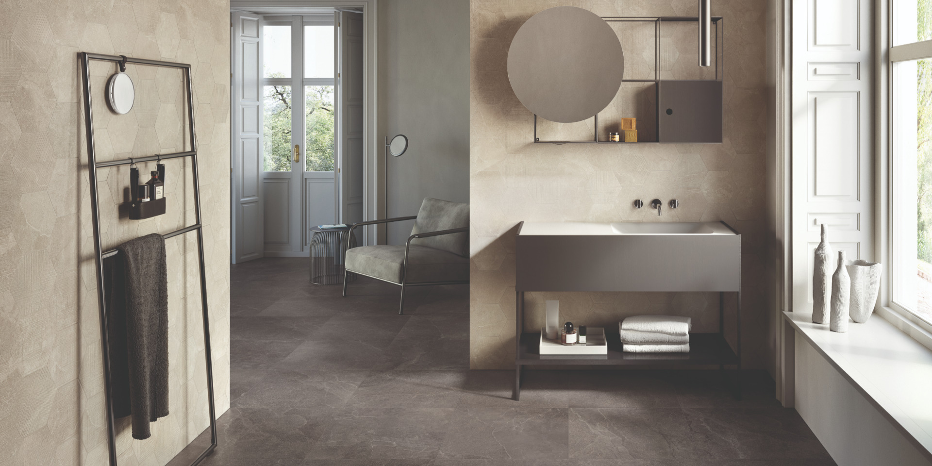 A stone effect collection comprising four warm shades, structured to emphasise the natural material’s surface, Randall is available in seven standard sizes: 600x1200mm, 800x800mm, 600x600mm, 300x600mm, 300x300mm, 75x300mm and 75x150mm.