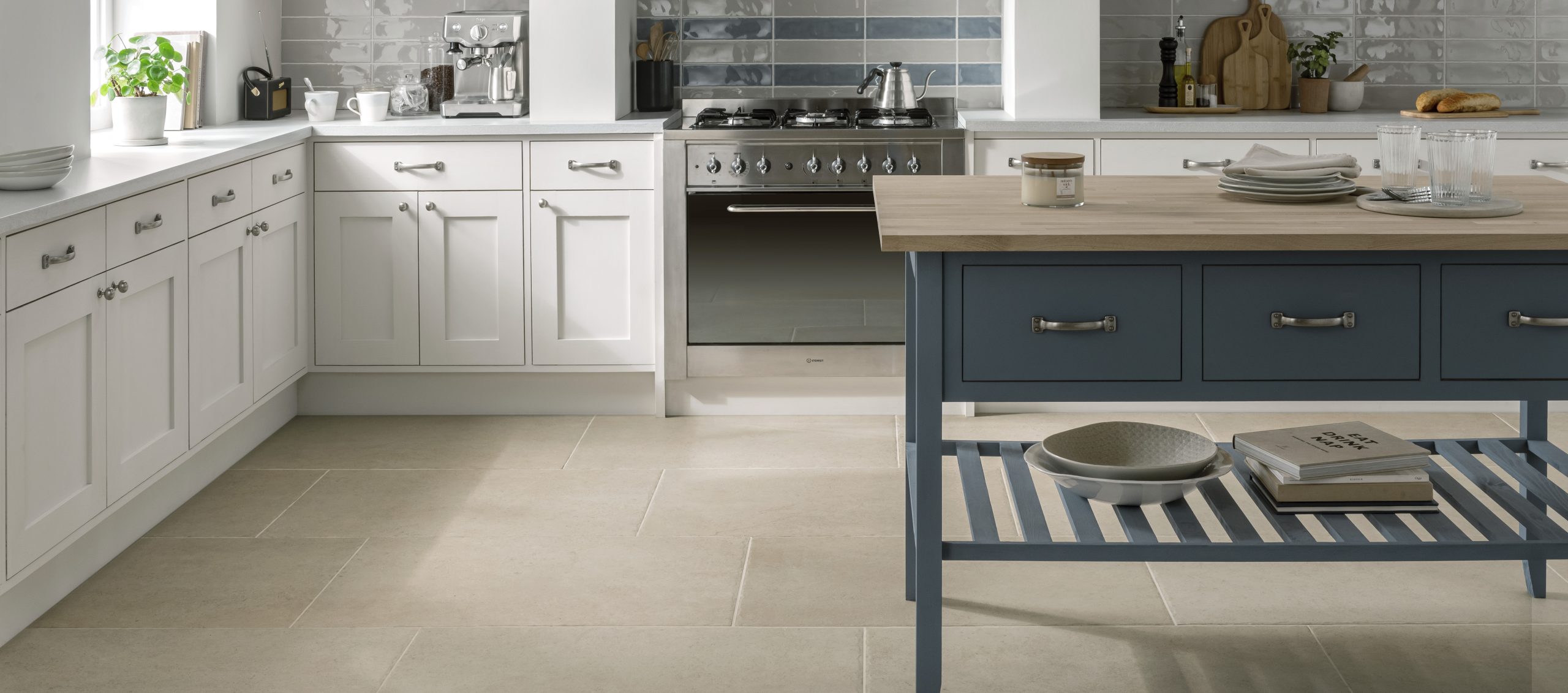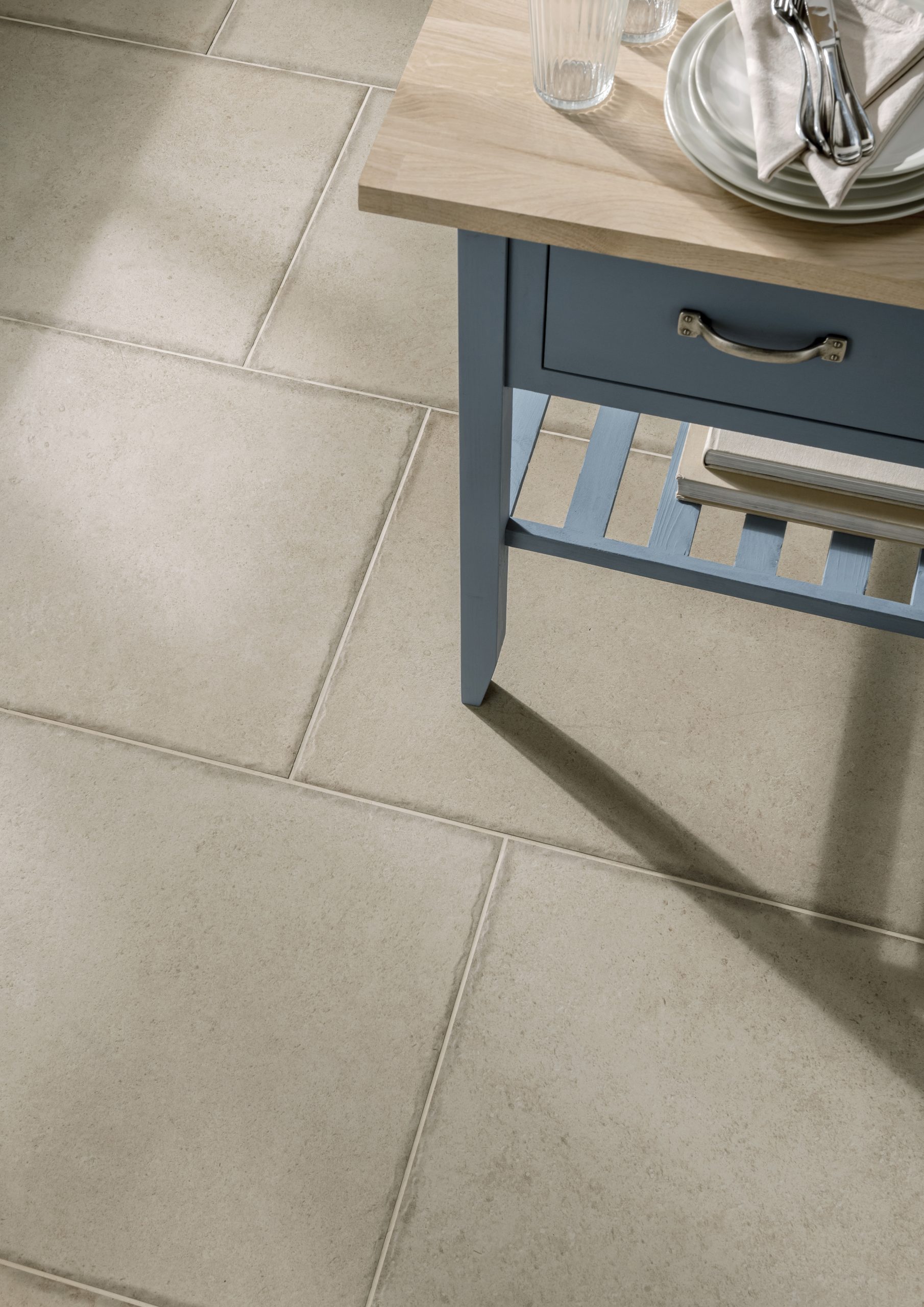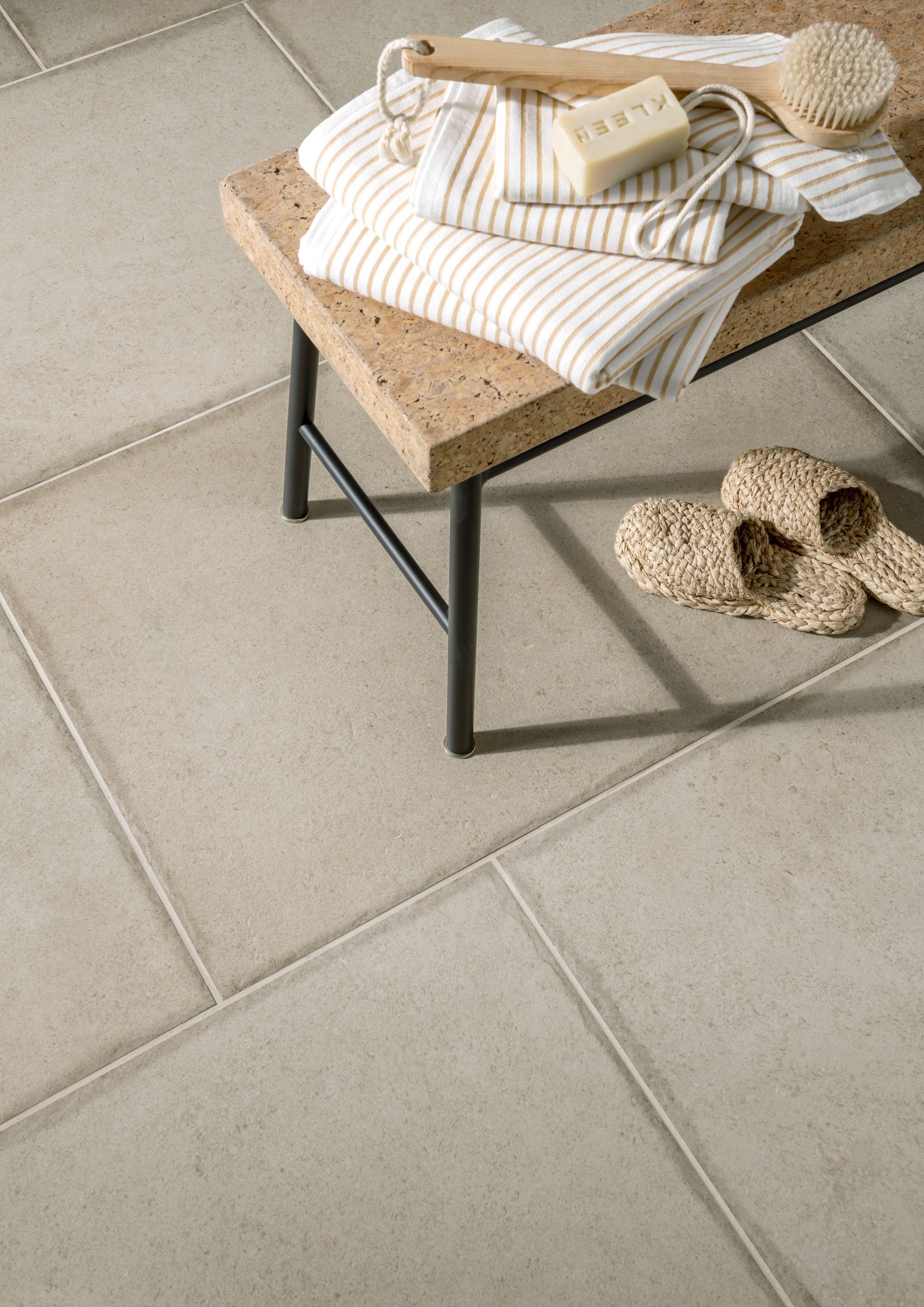 Stamford is a limestone-effect porcelain tile inspired by the flagstones in Burgundy.