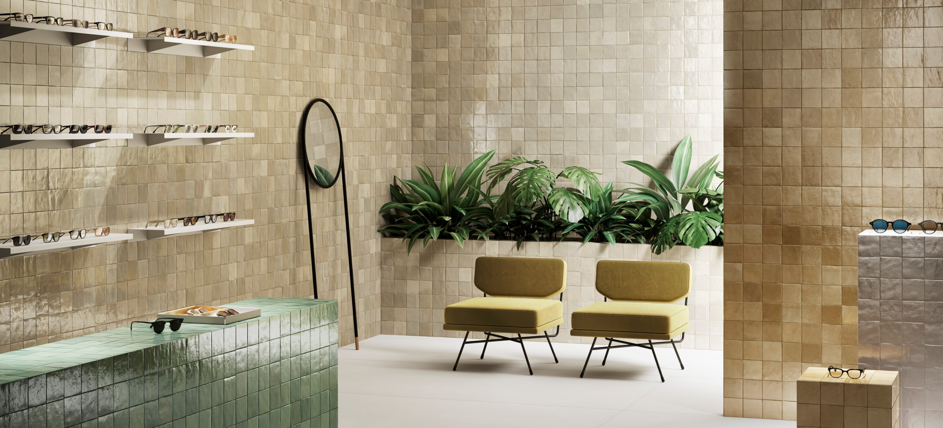 North African tradition meets industrial ceramics. The hand-crafted look tiles in the Zellige series are produced in 12 shades with glossy finish and visible variations in tone. Random installation creates a blend effect, in which the colours vibrate strongly.