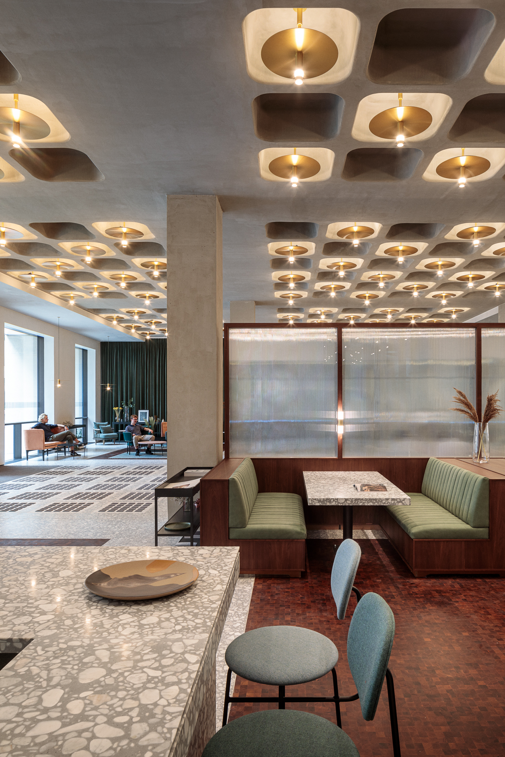 We were able to fabricate the large 1m slabs into grids with square inserts, a design influenced by the lighting above, mirroring the modular design and in turn creating a homogeneous feeling as you enter the entrance impactful with its high ceilings, warm open space, integrated café and shared workspace.
