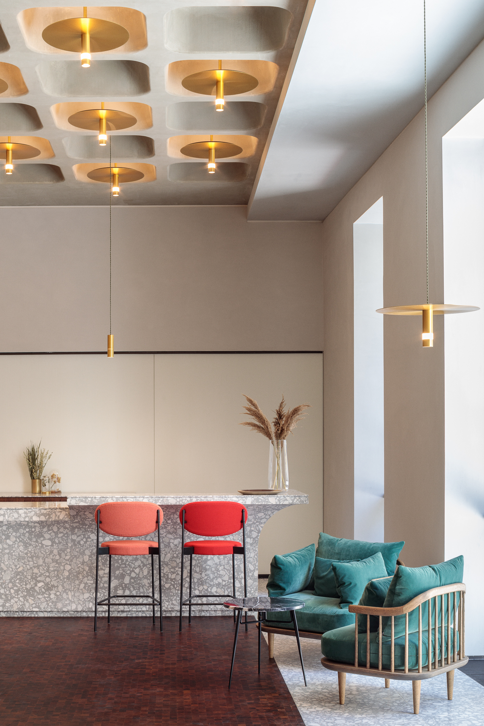 As you initially enter the building, the inserts are filled with an entrance mat material, then as you explore further into the building this changes to an insert of the same Technical Stone Marble but in a contrasting colour. Each small insert of the contrasting colour was glued into place at the factory before each tile was then repolished to achieve a perfect level and homogeneous aesthetic effect. Moving away from the entrance area, our Technical Stone Marble has been used in other applications including the bar area, tabletops and on the reception desk, demonstrating its versatility and hardwearing nature.