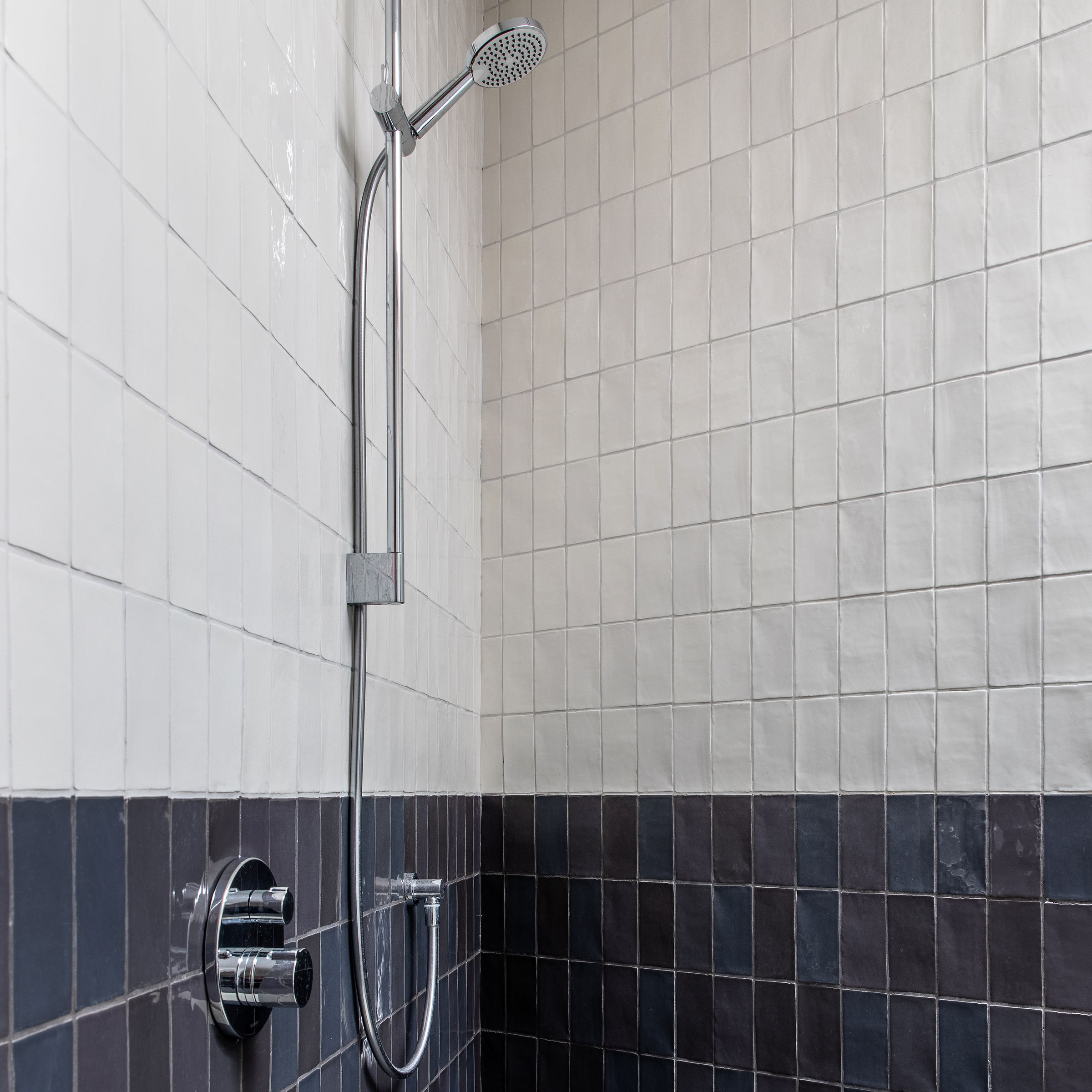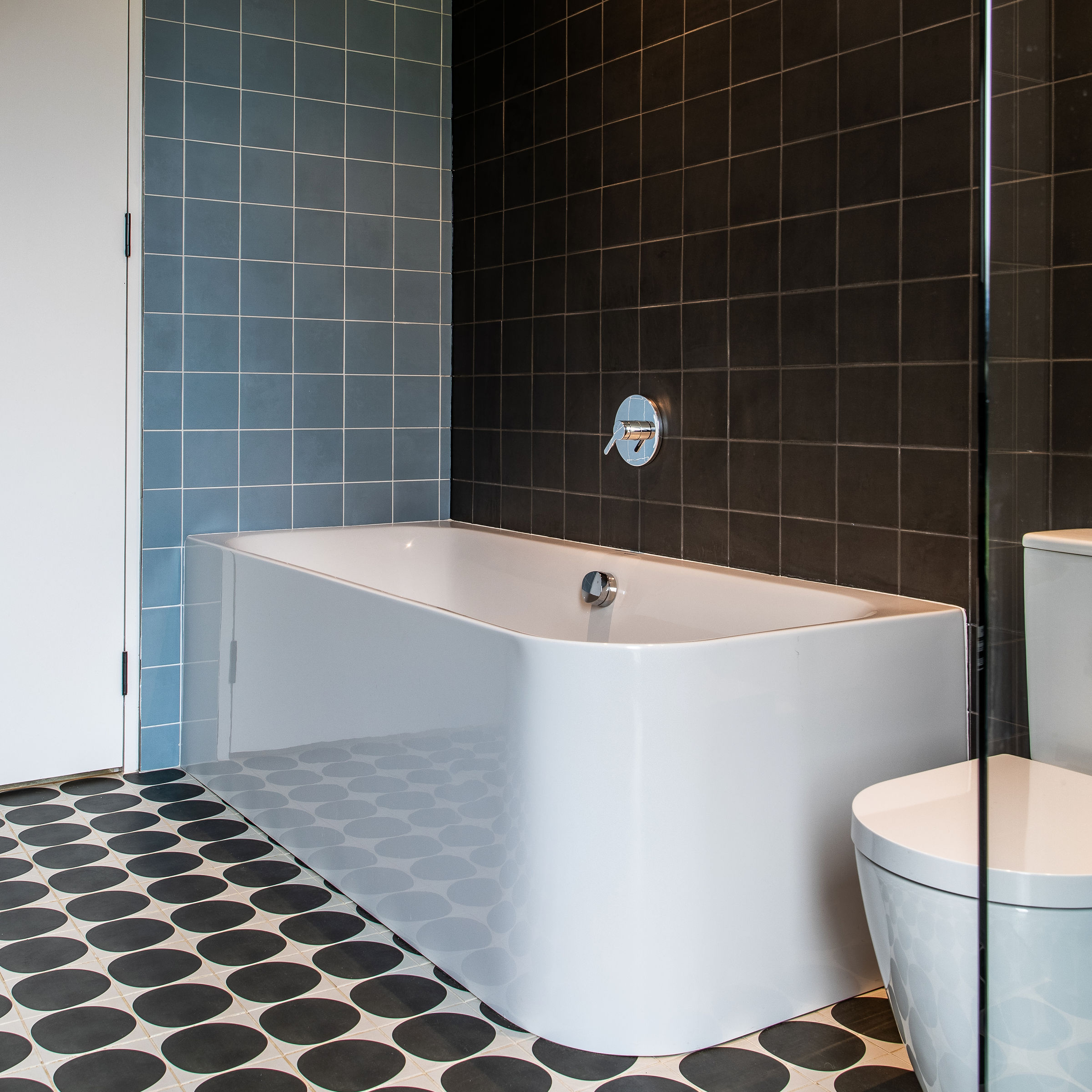 Our final stop was the master en-suite, which features our Oktra Drops on the floor. A contemporary take on a traditional patterned floor tile, it’s been combined with Oktra Plain on the walls for a strong visual impact.