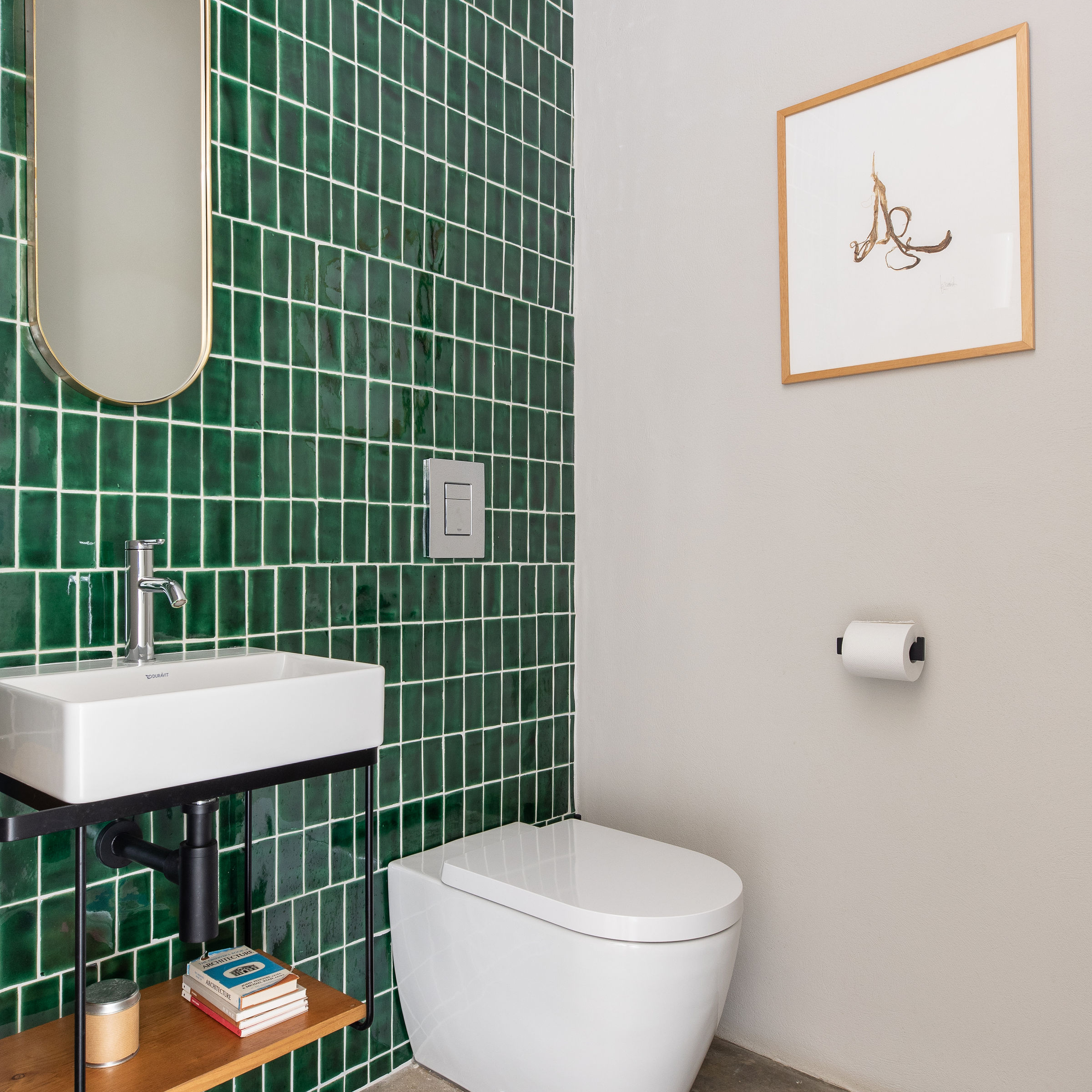 The first thing that struck us upon entering was the considered approach that has been adopted throughout the space. Nothing is too dominating with great thought being given to creating a balanced design. The public areas of the kitchen and living room are inviting and evoke a sense of calm while the bathroom, en-suite and cloakroom presented an opportunity to inject some character. Colour was an important factor in achieving this, a prime example being the green tiles chosen for the cloakroom. By offsetting the vertical stack bond laying pattern every five rows, this classic small-format tile in a bold and playful green creates a real sense of movement in the space.