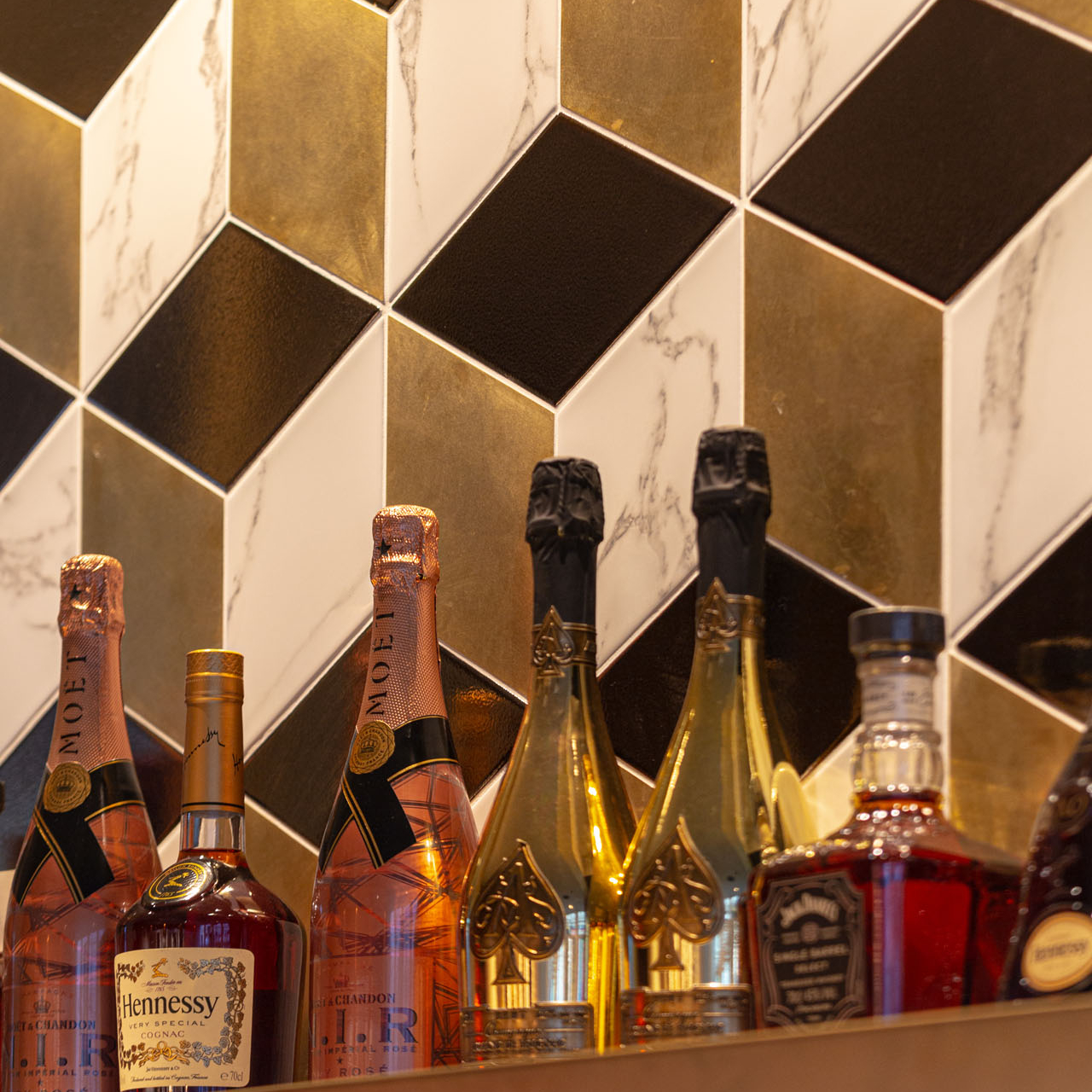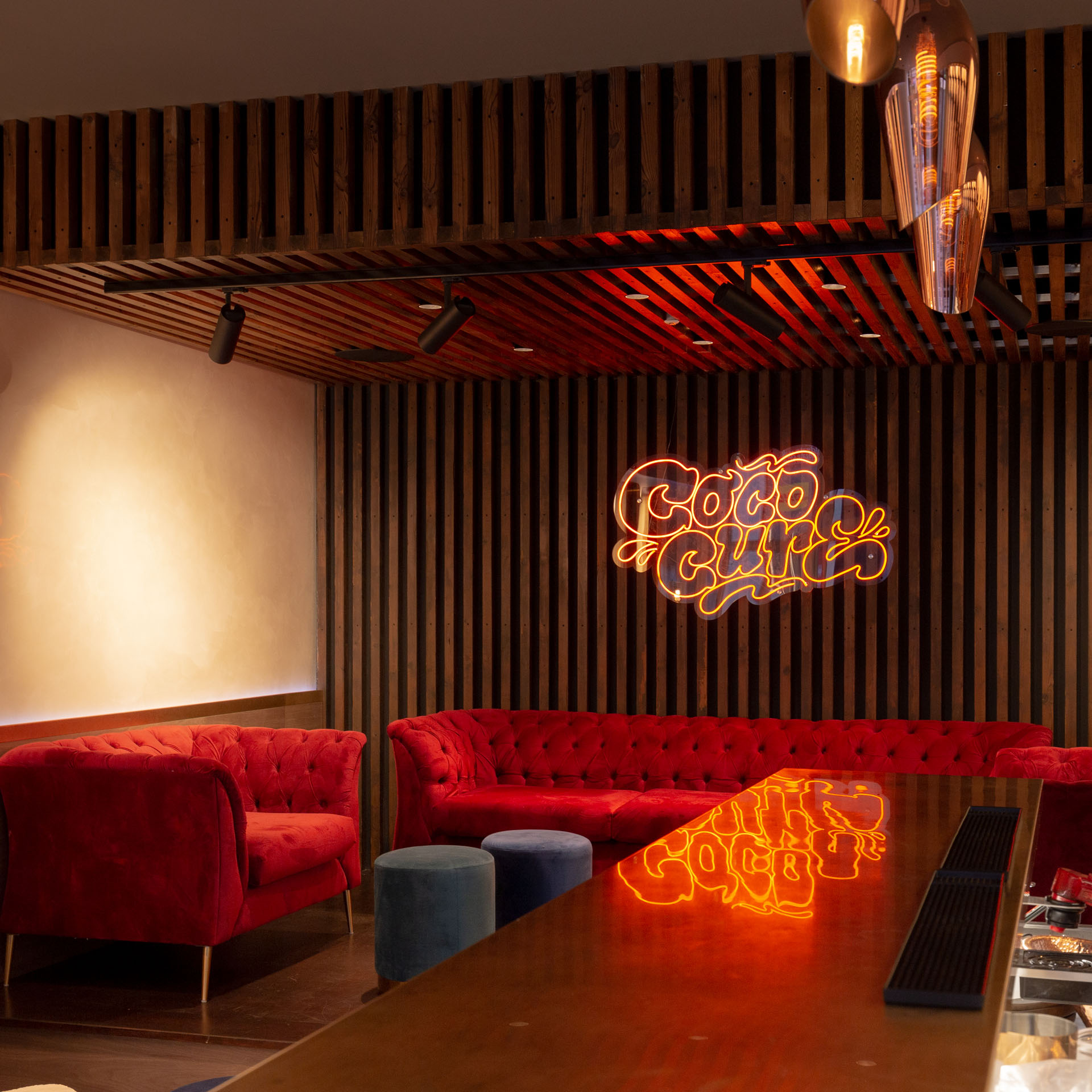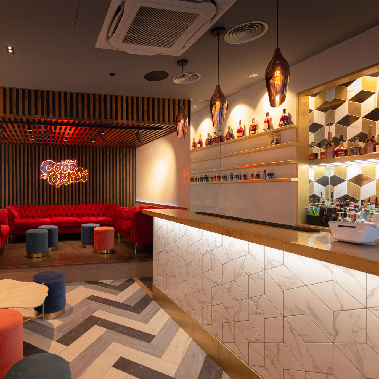 The materiality was lifted from the client’s branding strategy which relates to culture and nature. The speak easy space upstairs is lined with timber louvers and wall panels to create the warmth and cosiness vibe. The bold colours and patterns, paired with the soft furnishings nod to the fun and playfulness of Cococure. In contrast, the bar area is cladded with our Sancy patterned wall tiles to emphasise luxurious details. The high-quality craftsmanship can be found in the laying of the triple-toned floor. These matt finish tiles with high slip-resistance that we sourced are water-jet cut to achieve the striking herringbone pattern.
