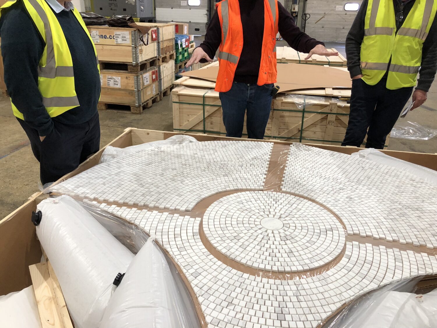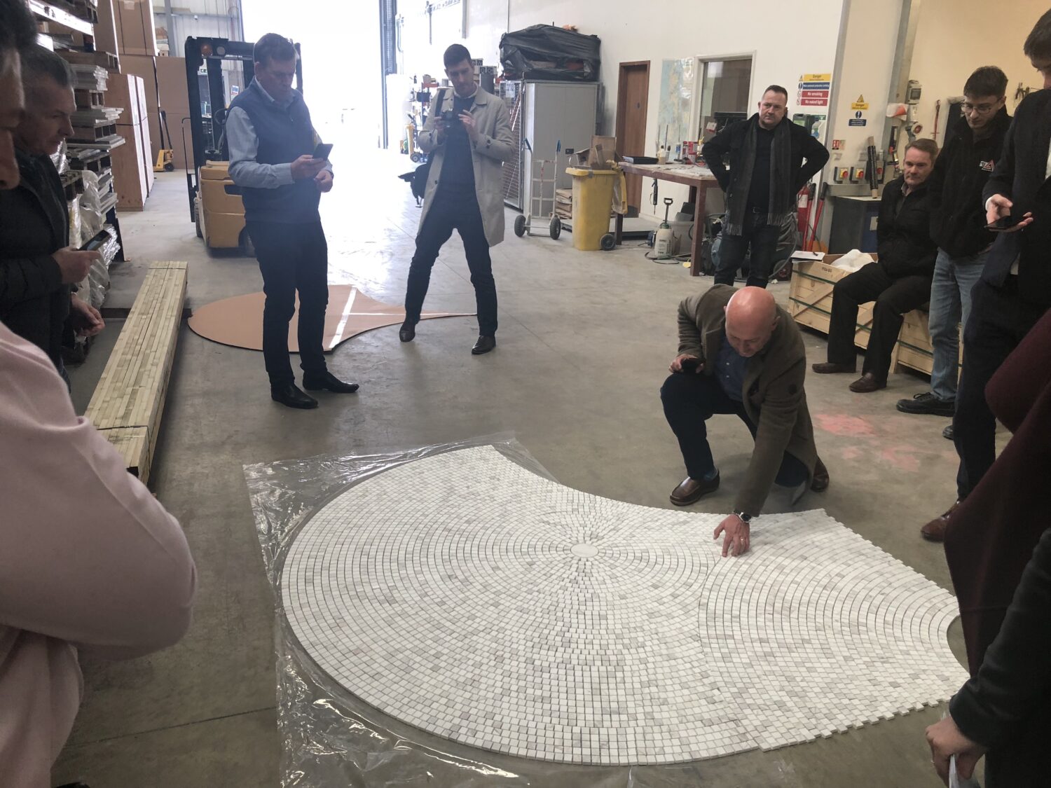 During the manufacturing process, we selected the stone to provide an agreed tonal variation within the materials. Once this was completed Strata began working on creating samples of the curved moulds required to produce the repeating fan pattern for the floors. These samples of the selected Volkais Stone and black Tulip were sent for approval by the design team and the client, and once completed the mosaic production began.