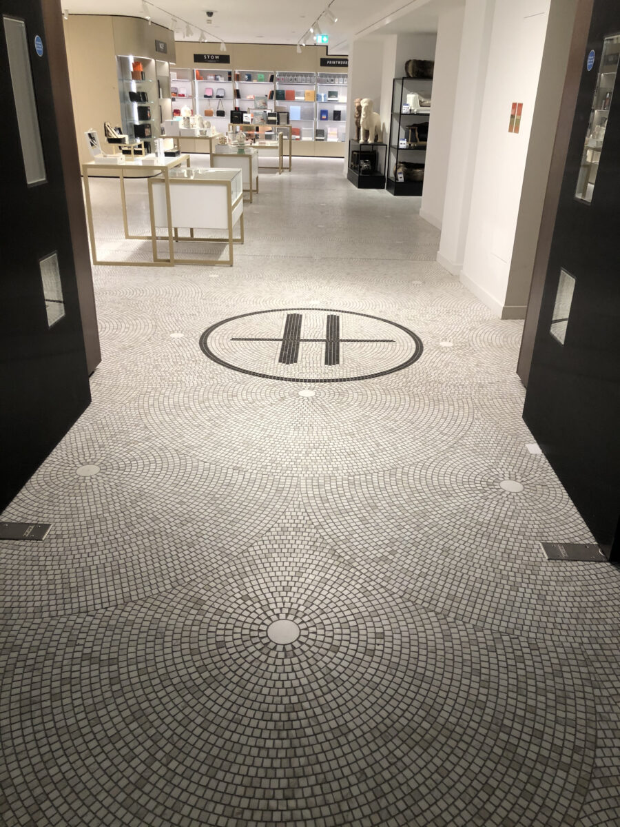 A striking bespoke design featuring Strata Natural Stone mosaic tiles creates a striking feature at the iconic Harrods flagship store.