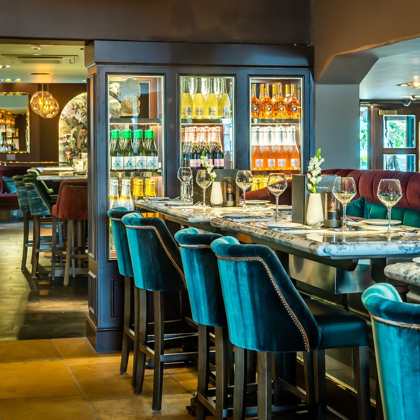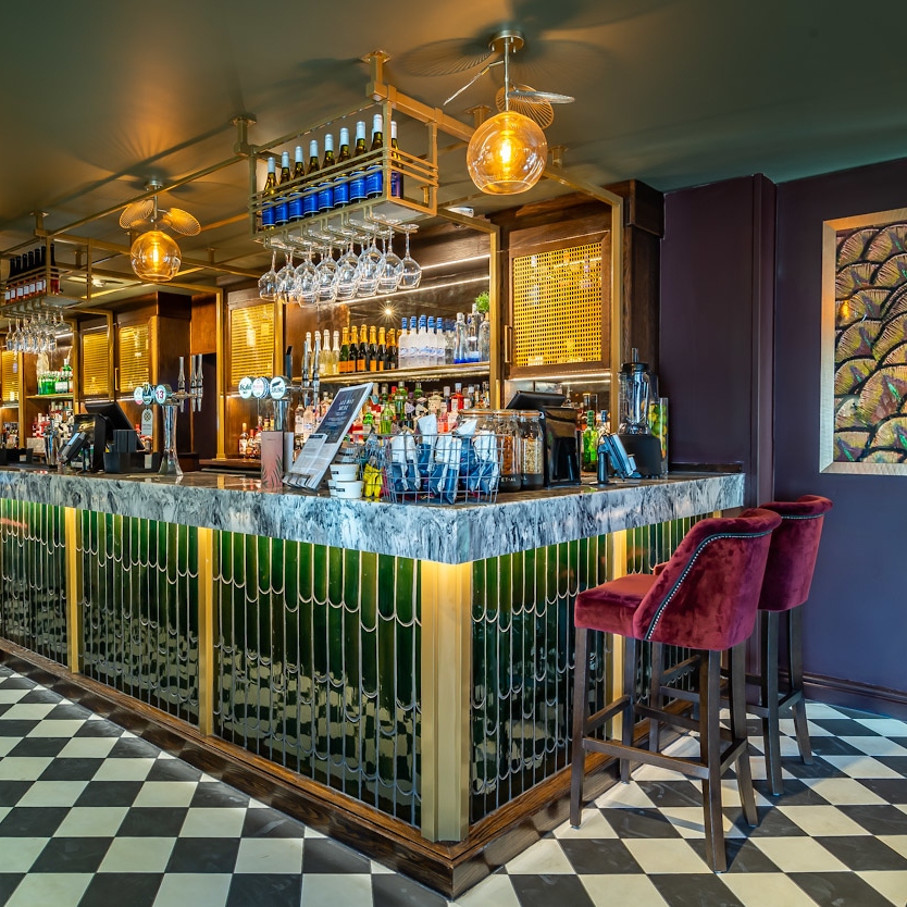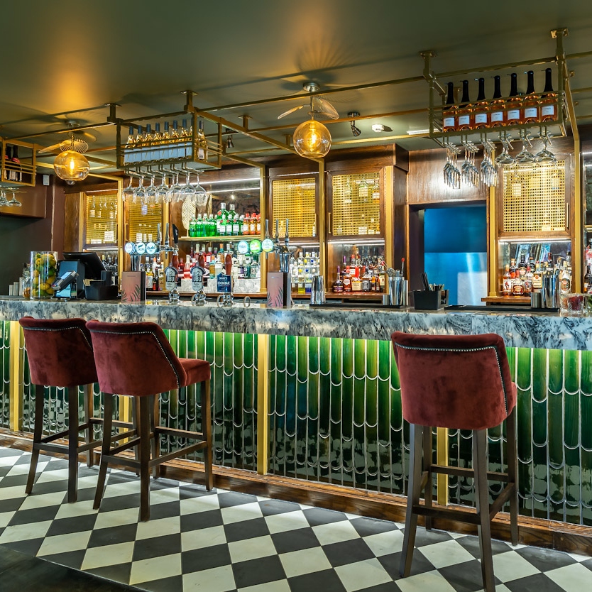 Our striking green tiles, sourced specifically for this project, take centre stage in the bar area, creating an instant impact. The wine-coloured bar stools, marble top and gold trims all add to the overall look of this small heritage but premium restaurant and bar.
