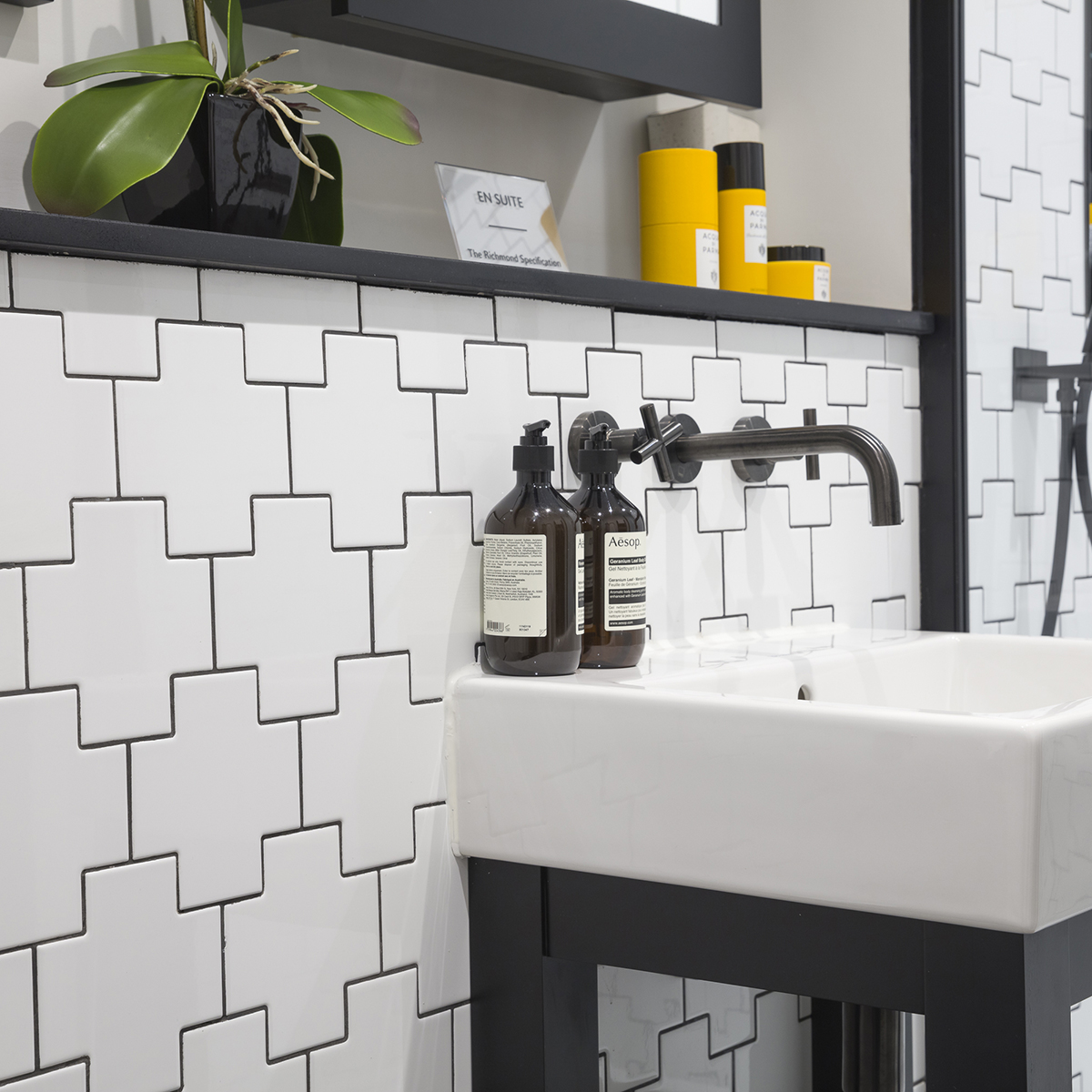 “We wanted to make sure that the bathrooms and en suites referenced the original finishes of the Telephone Exchange building at the heart of Royal Exchange,” says Jane Bartlett, St George. “Struggling to find what we needed in a standard range, we developed a bespoke tile with Parkside, creating a bold motif and a hand-crafted quality that references heritage. We’re thrilled with the final look – it has just the right nod to heritage, while still maintaining the smart and contemporary feel wanted by our purchasers.”