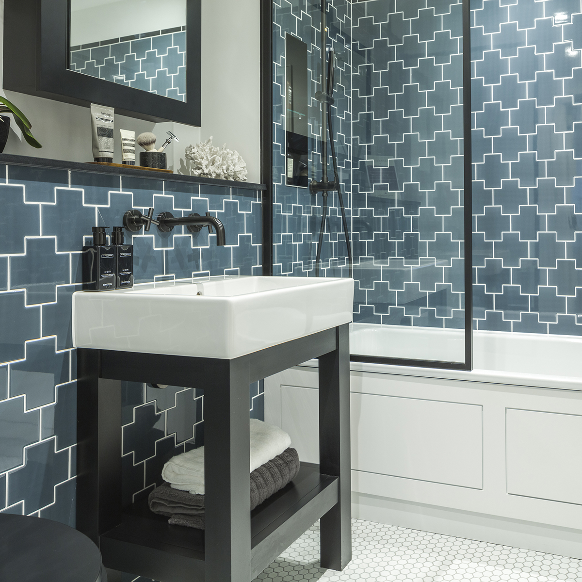 Inspired by the architecture of the Grade II listed Old Post Office and Telephone Exchange buildings within the development, the design team at St George selected Hexil mosaics and developed a bespoke tile to create a link to the heritage of the site in new buildings. The stylish cross motif with a handmade feel is now part of the Parkside collection as Acrux, made with 39% recycled content.