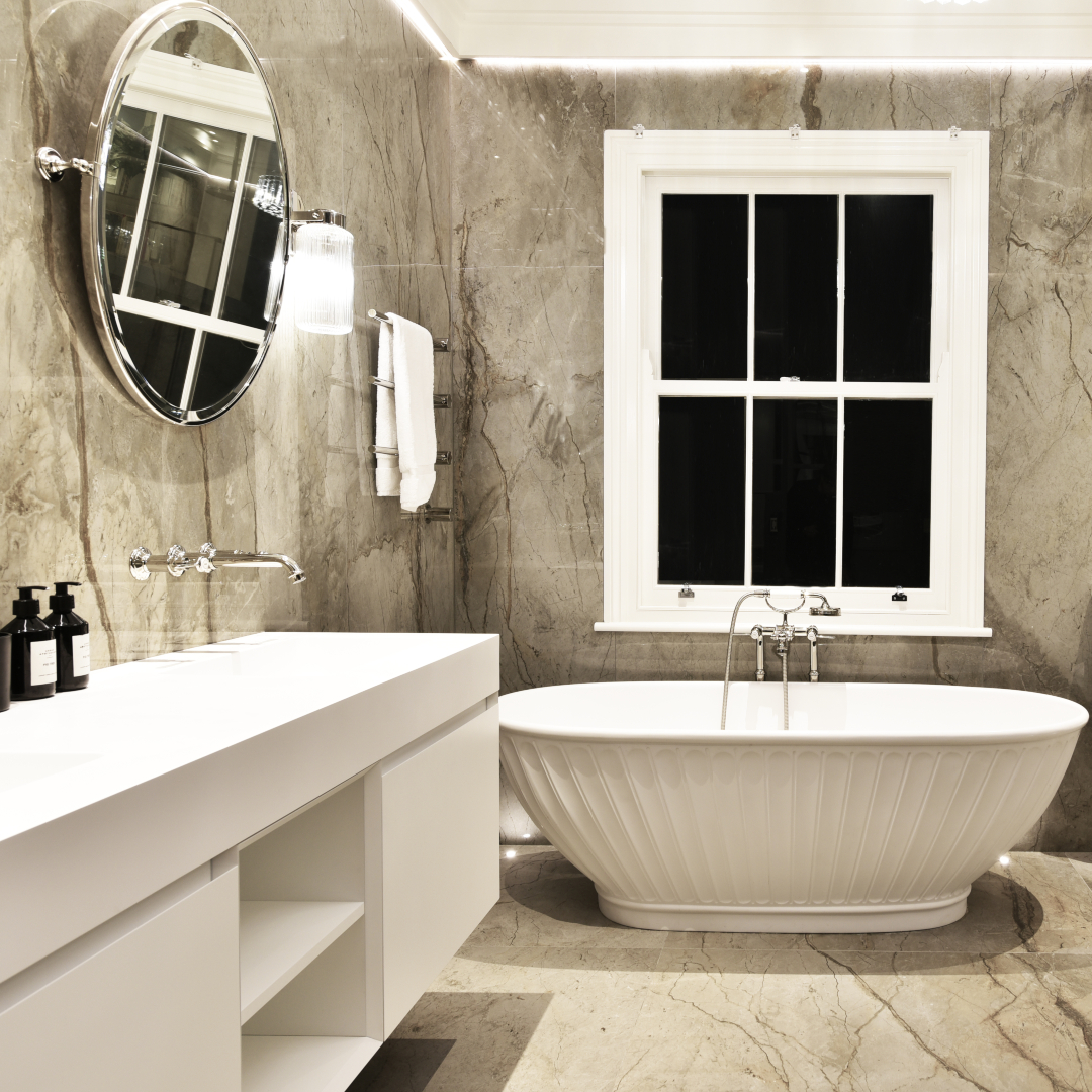 Moving upstairs and the master bathroom features his and hers basins as well as a wonderful freestanding bath. We sourced a large format 1200x2600mm tile specifically for this project that would evoke a sense of luxury and warmth. The matt finish was chosen for the floors and the polished finish creates a high-gloss look for the walls.
