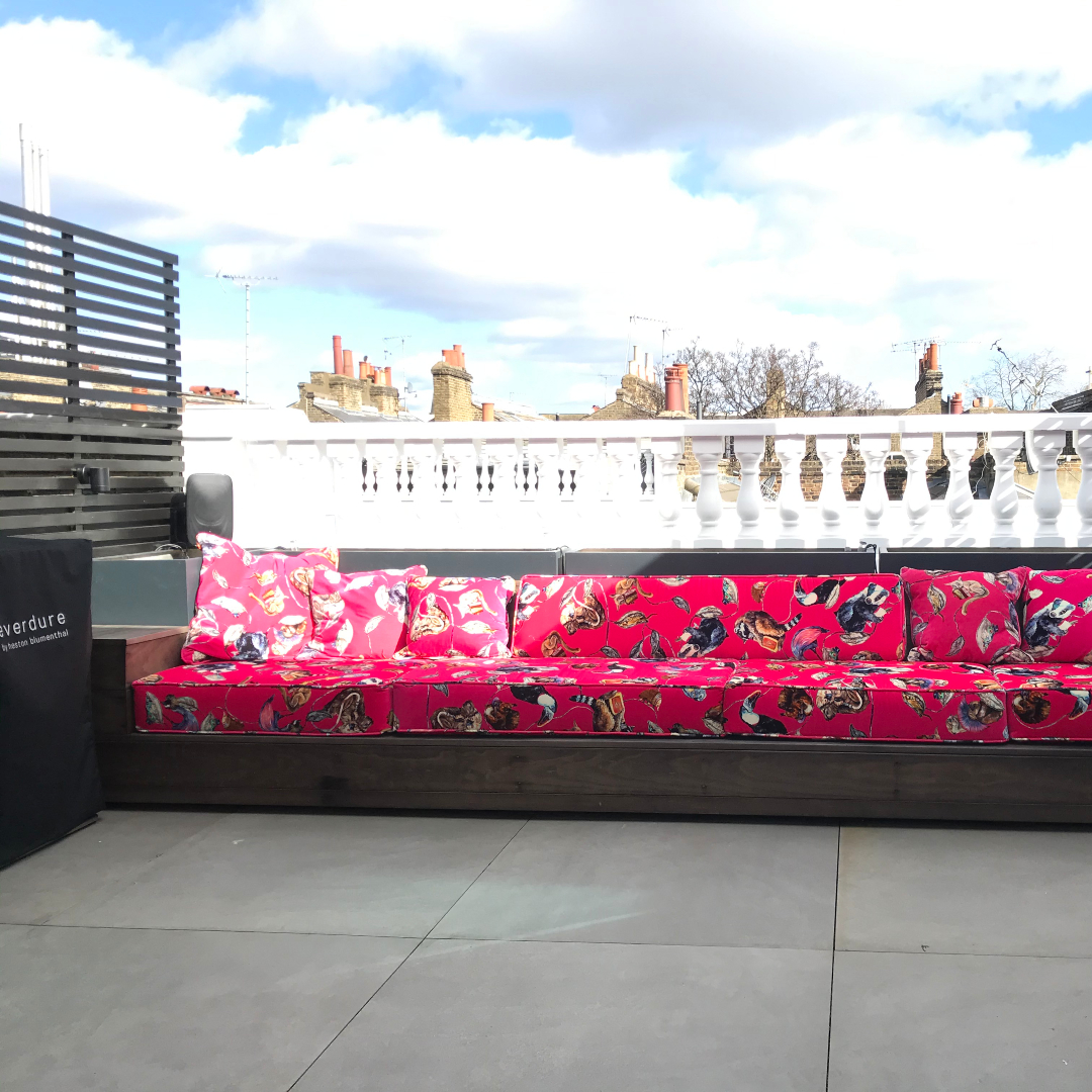 The bold patterns continue out onto the terrace, its seating area adorned with an impactful animal print. Our Vale tiles in Taupe were the ideal choice thanks to their high slip resistance and timeless concrete effect.