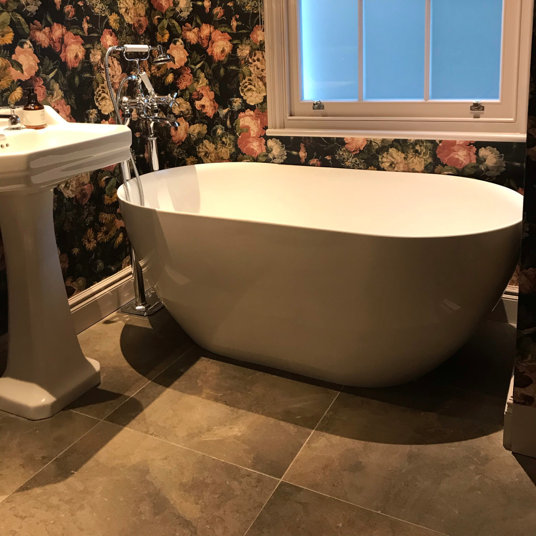 Another bathroom within the property features our Blouche tiles in the Augustus colourway. This space has real character with the bold, floral pattern on the walls and traditional sanitaryware options.