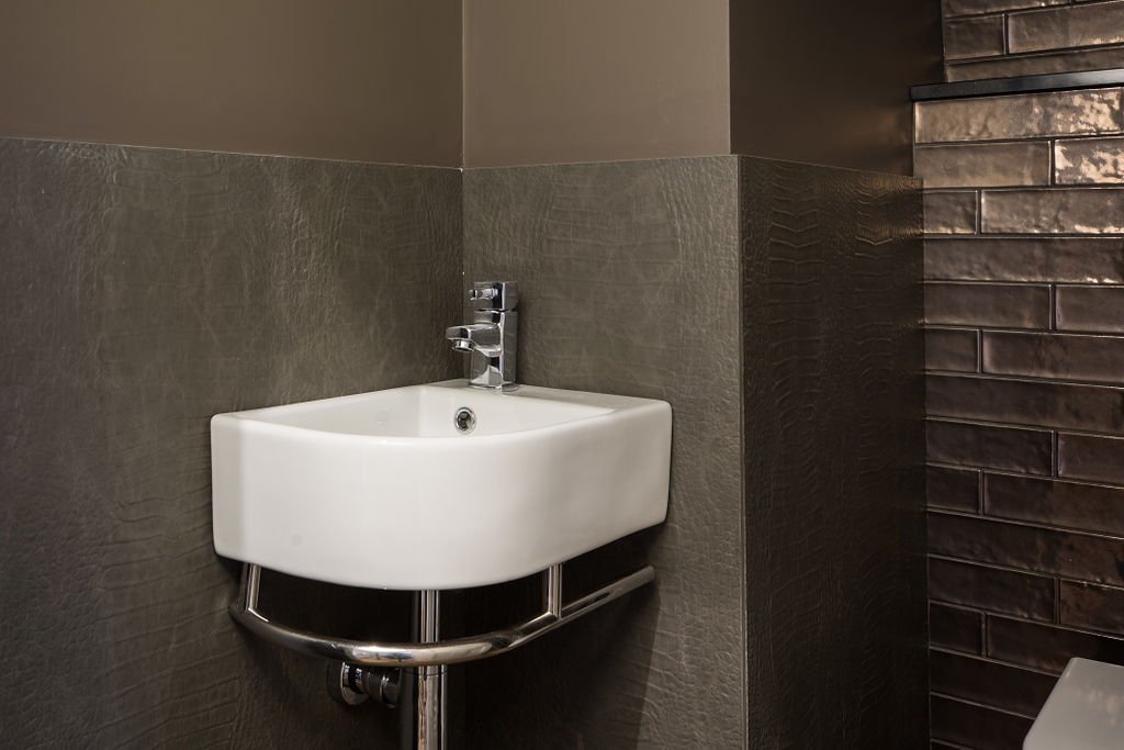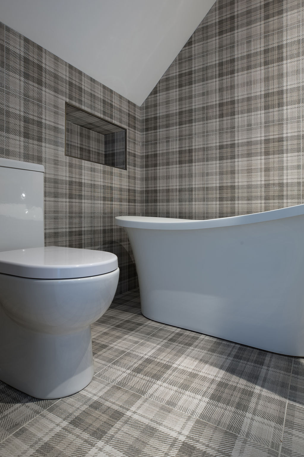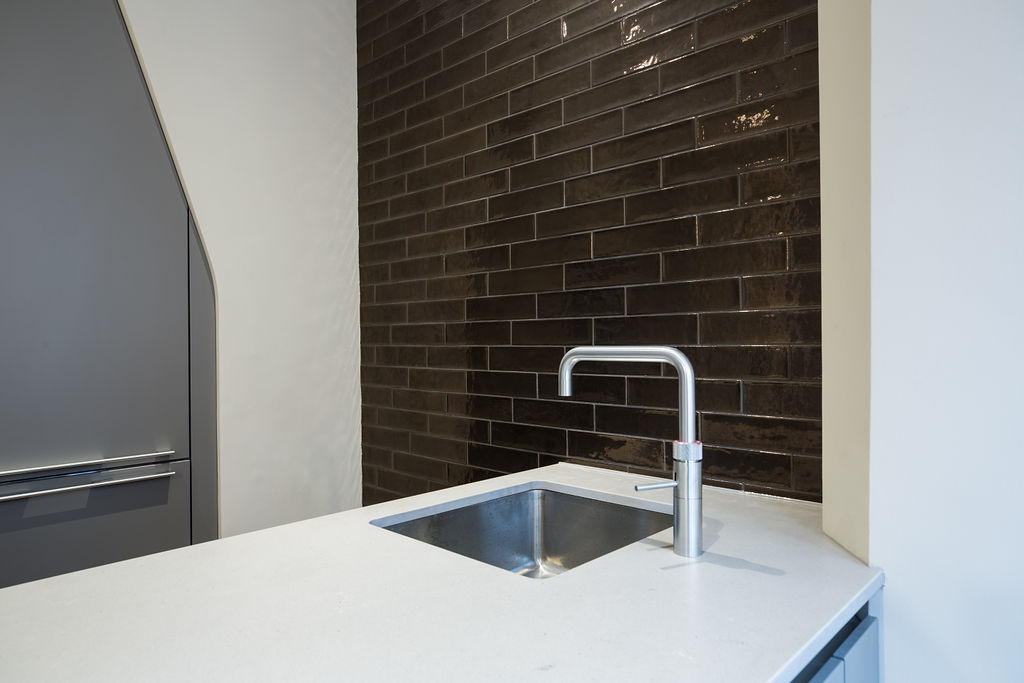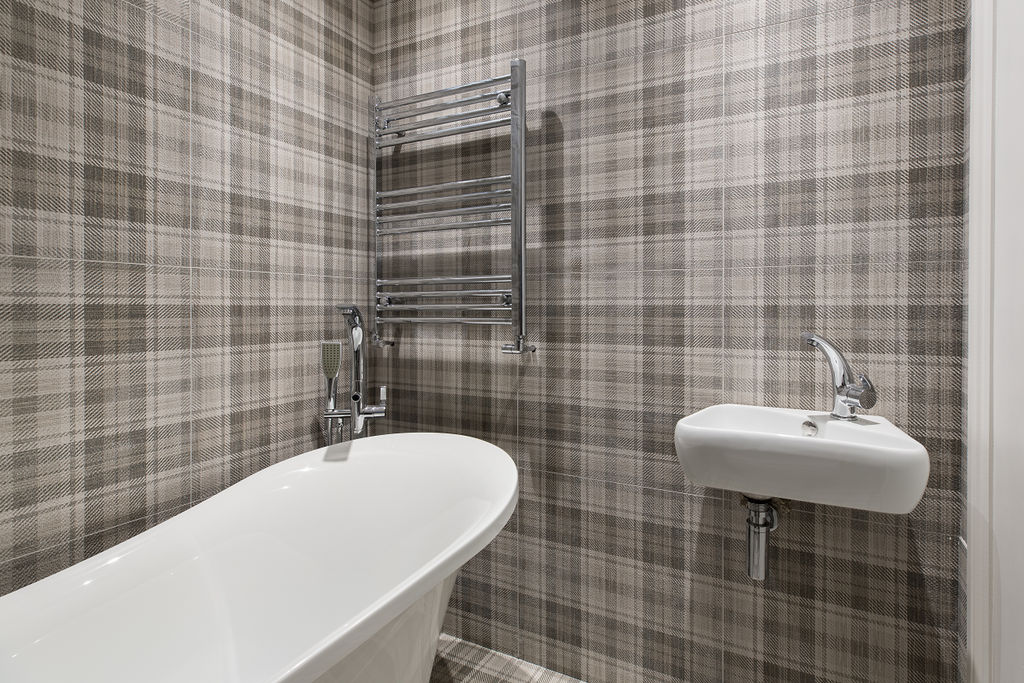 David from DMM London has worked with Nicola from Parkside for over 15 years as she “knows tile and design inside out”. David visited our Chelsea showroom with some ideas from the client and worked with Nicola to fine tune the design, with the client being involved throughout the design process. The stunning kitchen has a feature tile wall and the client wanted a tile with some shine to it. The same tile was used on the back wall in the WC for visual continuity. The master bathroom features Black Calacatta as a striking feature wall and the upstairs bathroom features Fyne Tartan on both the floor and wall to give the illusion of a larger space.