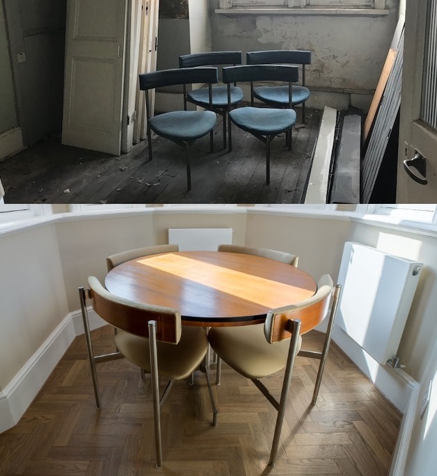DMM London were keen to keep some original aspects of the flat that they found such as the original handrails and spindles to the staircase, the old lift shaft as well as reupholstering the table and chairs that were in desperate need of some TLC.