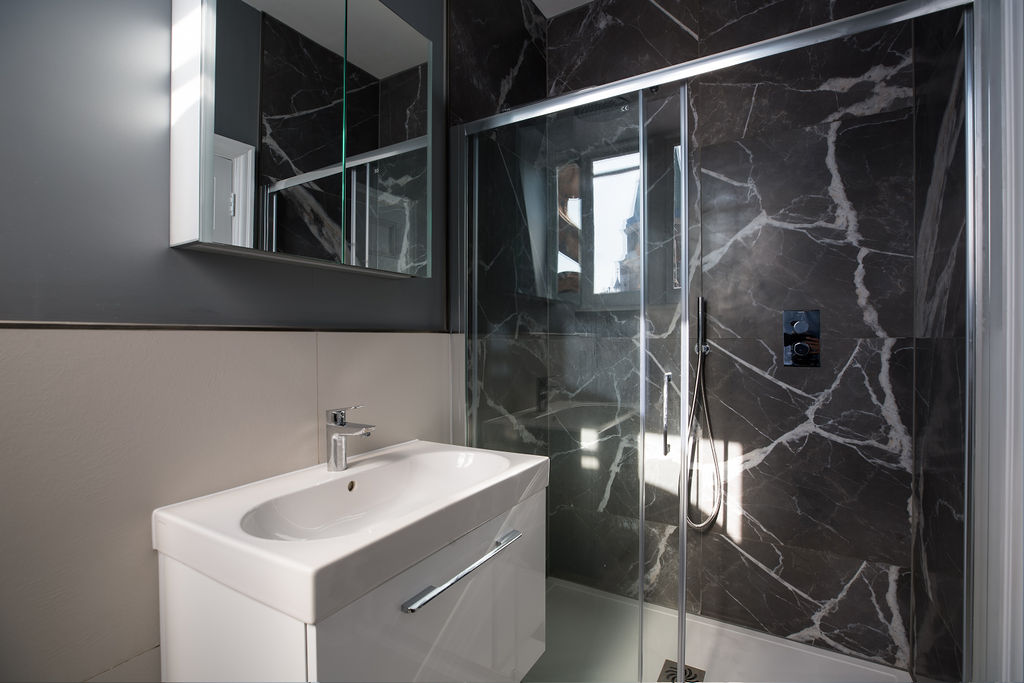 The client appointed DMM London Ltd, professionals in construction, to carry out the design and refurb work over a 6 month period. The building is listed, meaning that certain elements such as the windows, original floorboards, entrance hall floor, two of the doors and other original features had to be kept. The work needed to conform to a licence to alter (LTA) which included various conditions that needed to be met. One of these was regarding the acoustics and a specialist was required to ensure that the work did not affect the overall decibel level of the flat. Five layers of acoustic build-up were needed under the wood floor to comply.