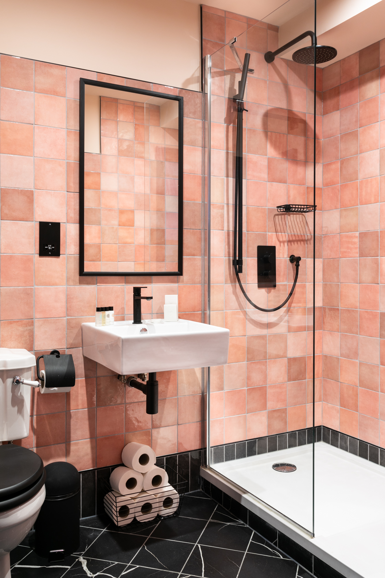 Marble effect tiles from Hound were chosen for all of the bathrooms to create a luxurious feel. Striking colours, such as the Rose from our Lyrical collection, were used on the walls to create a real statement.