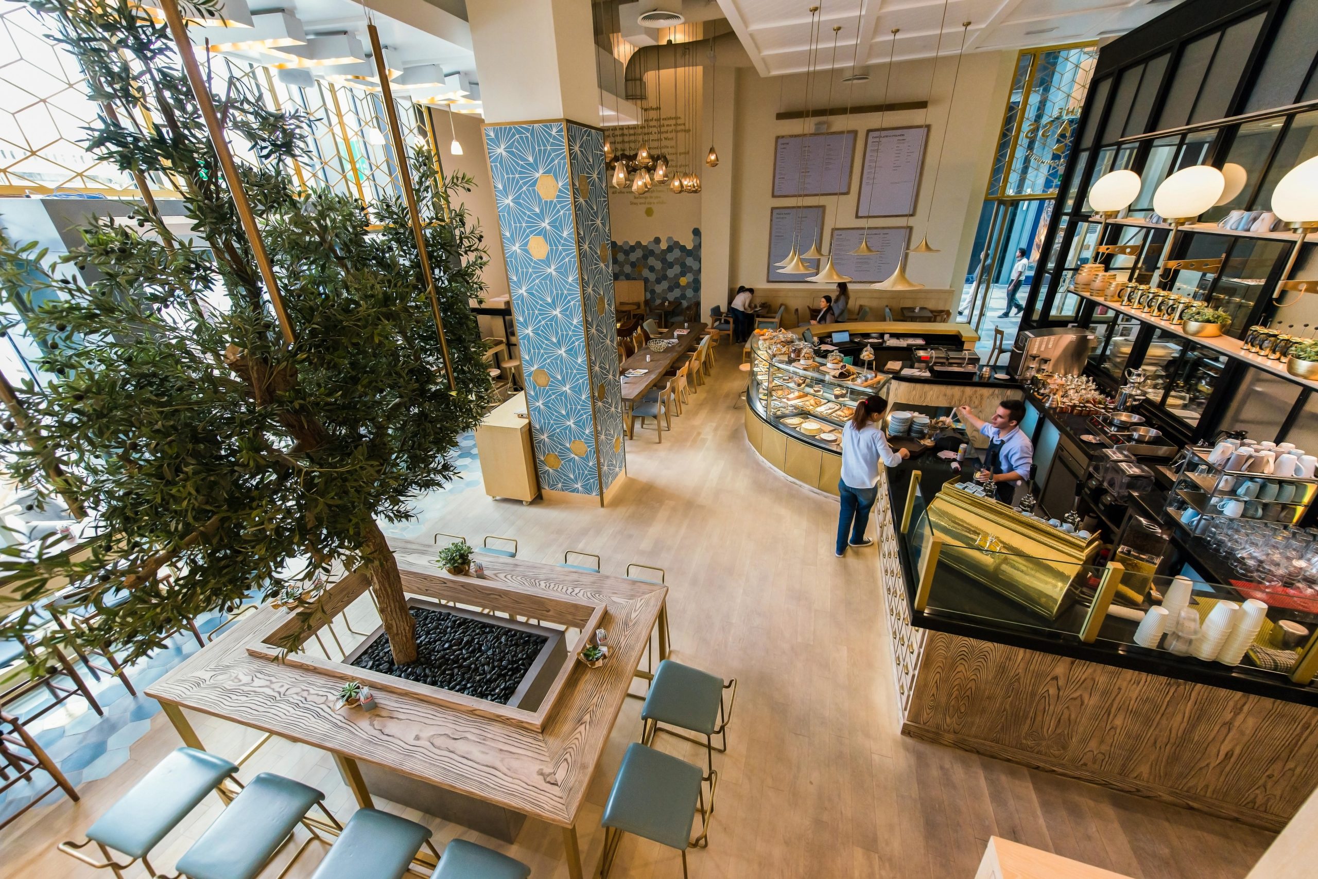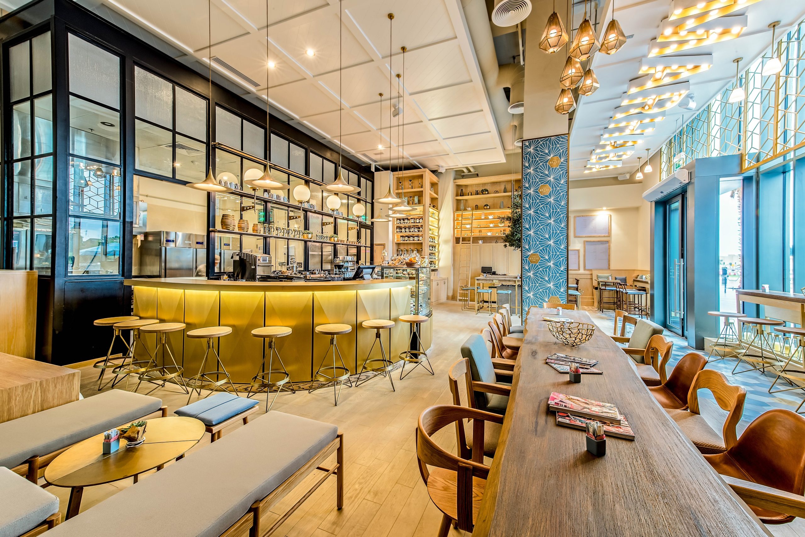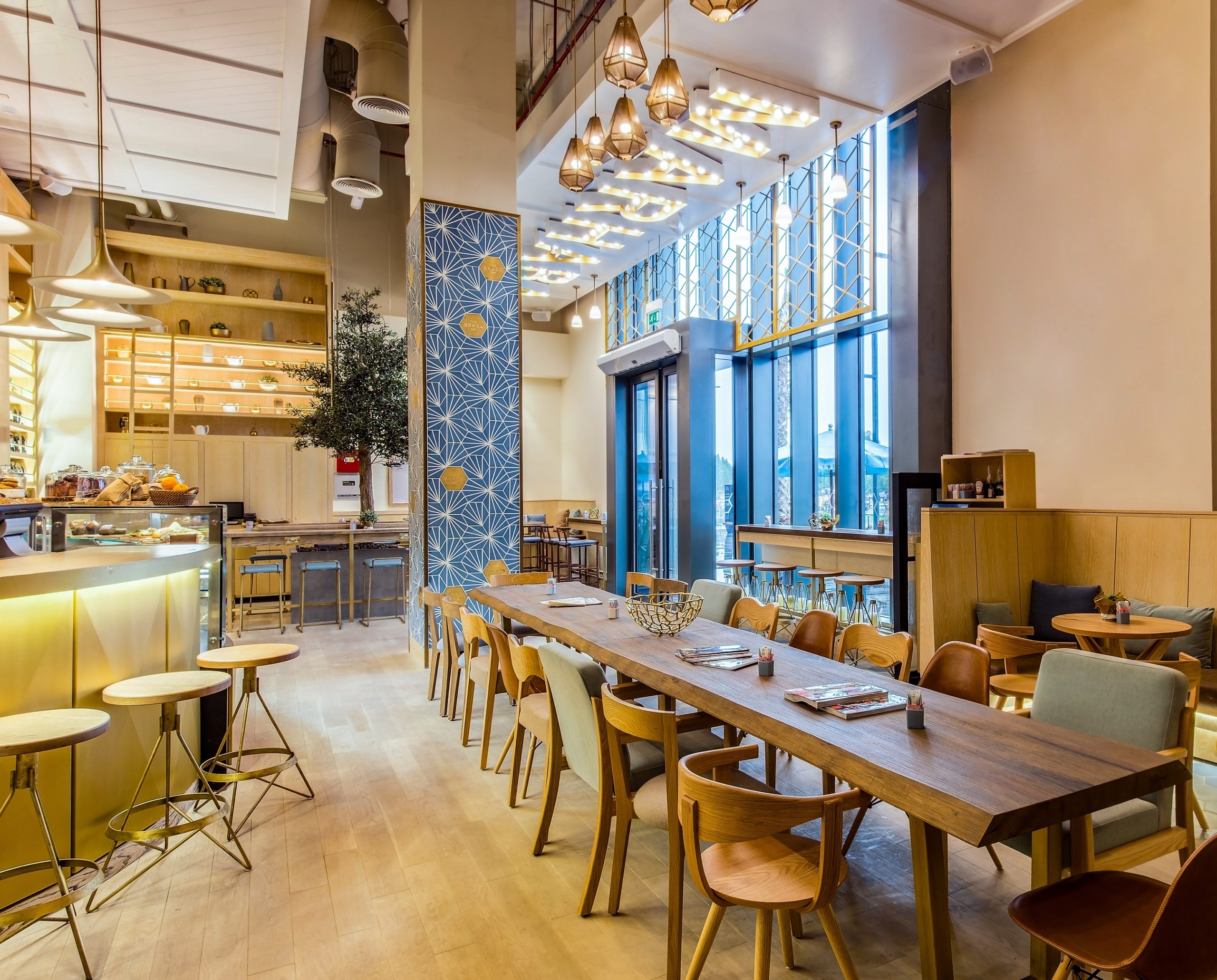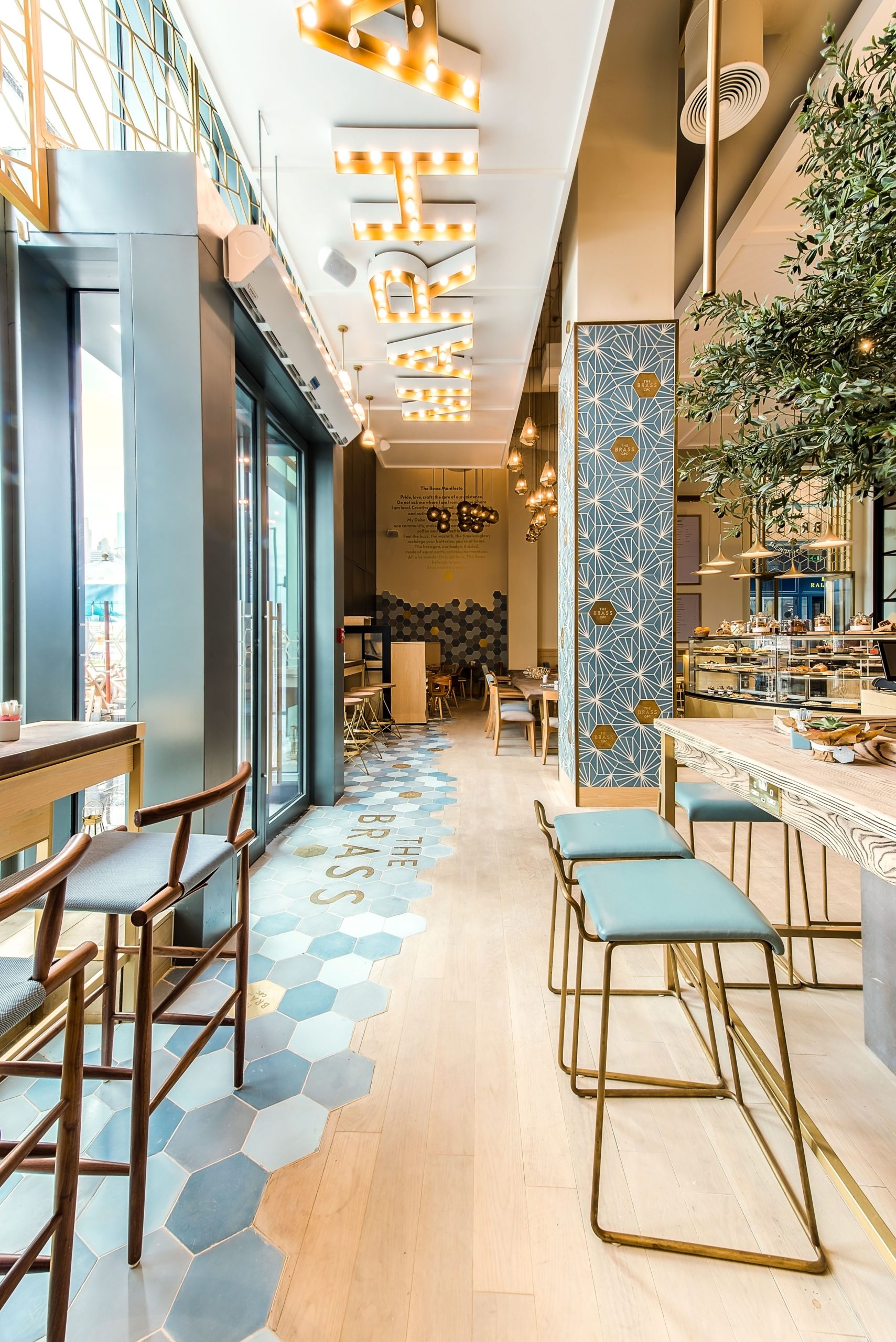 Encaustic cement hexagons with a decorative design were supplied to colour match with the colour scheme of The Brass branding, complemented with real brass hexagons that were cut, etched with The Brass logo and dull polished to give a soft reflection. Plain hexagons were supplied for the floor, again colour matching with the overall colour scheme of the project.